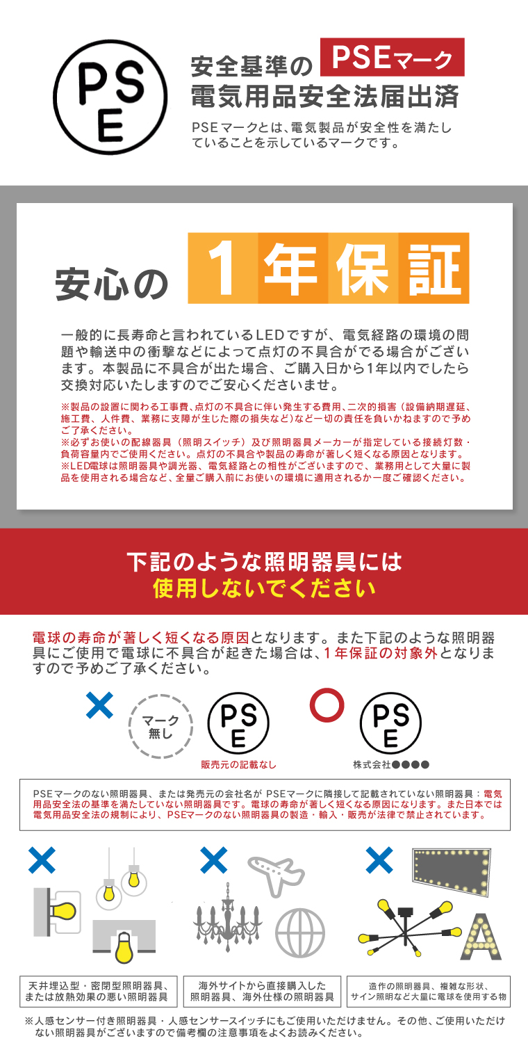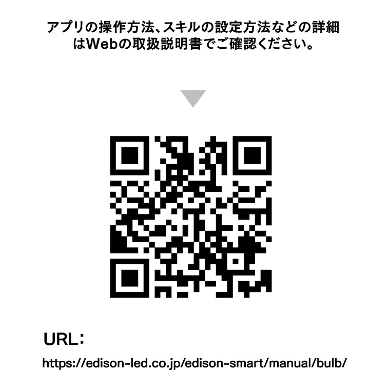 | 備考 | ※壁スイッチなどからのオンオフ操作も可能ではありますが、デバイスがリセット状態に戻る(点滅状態になる)ことがございますので、壁スイッチでの操作はなるべくお控えください。 ※この製品・アプリは日本国内専用です。 ※交流100V、周波数50/60Hz以外での電源では使用しないでください。 ※電球のみの販売です。その他の器具は別でお買い求めください。 ※調光器スイッチ、断熱材施工器具、密閉型器具には使用しないでください。 ※自動点灯機能付器具、リモコン付の器具等では動作しない可能性がございます。 ※製品の設置に関わる工事費、点灯の不具合に伴い発生する費用、二次的損害(設置納期遅延、施工費、人件費、業務に支障が生じた際の損失等)など一切の責任を負いかねますので予めご了承ください。