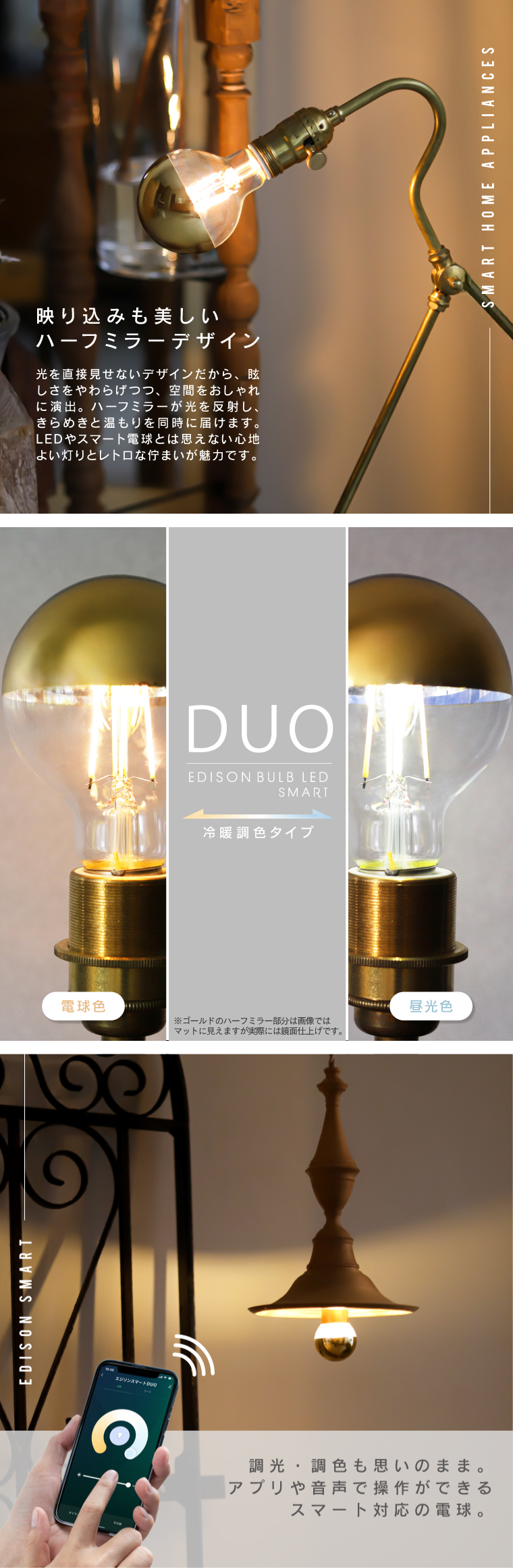 ■「DUO」シリーズのポイント従来の「エジソンバルブLEDスマート」は電球色のみの単色仕様でしたが、DUOは「冷暖調色機能」を搭載。