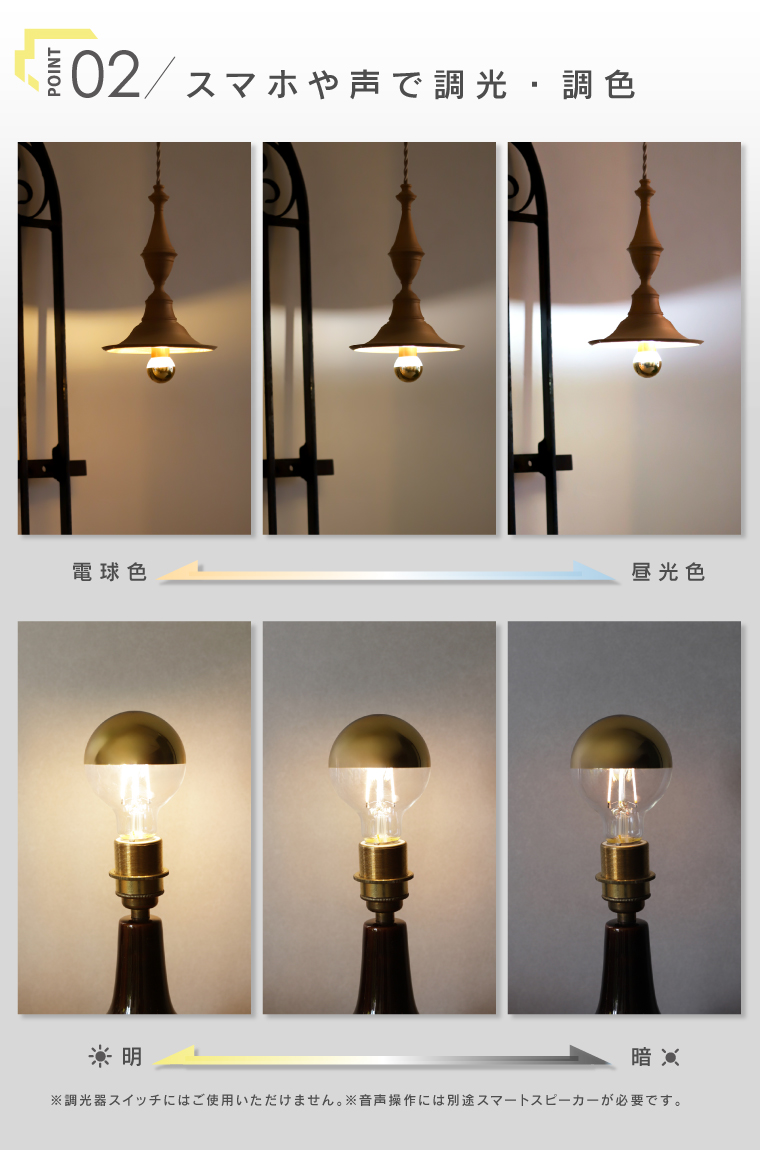 二種類のLEDフィラメント(白色+電球色)によって実現した、新しいスマートエジソン電球です。