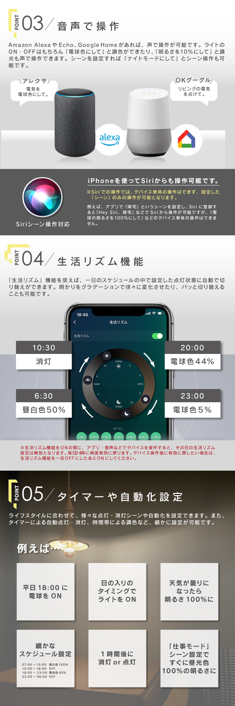 起床・就寝・帰宅時間に合わせて自動点灯。