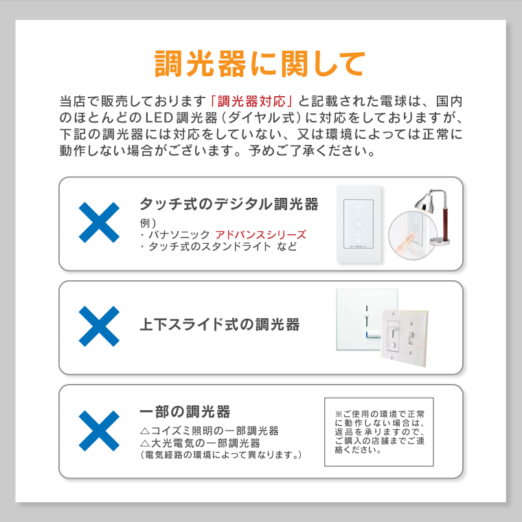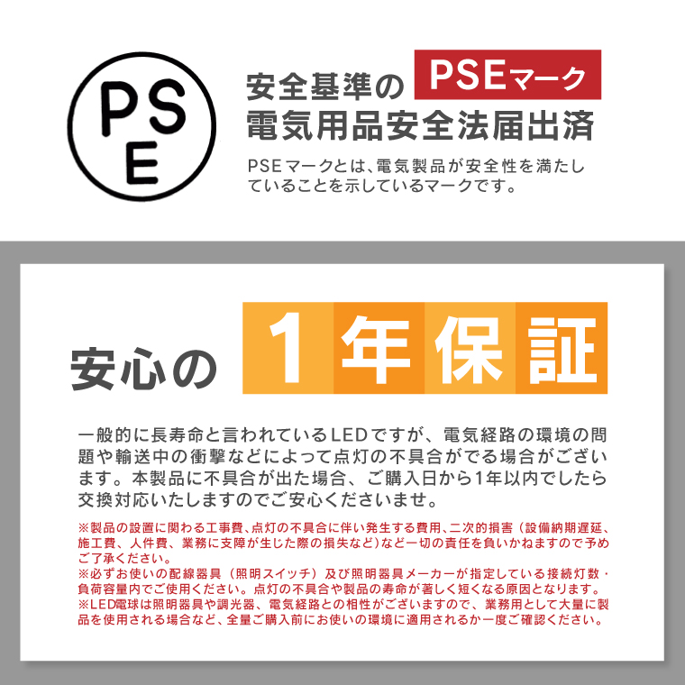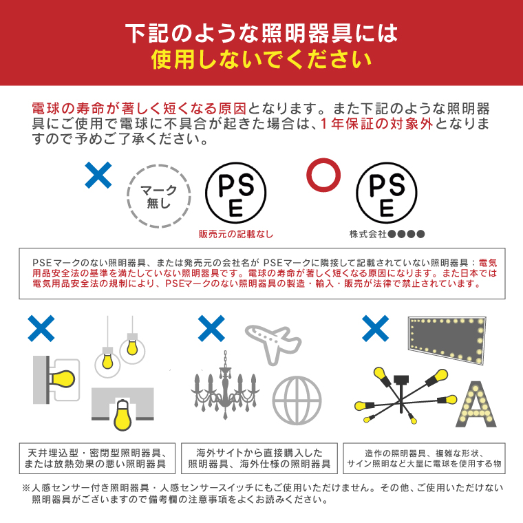 ※自動点灯機能付器具、リモコン付の器具などでは動作しない可能性がございます。 ※ 断熱材施工器具[SB、SGI、SG形表示器具]、密閉型器具には使用しないでください。(このほか使用器具の種類によって寸法的、熱的、その他の状況により使用できない場合があります。) ※位置表示灯内蔵形スイッチ(ホタルスイッチ)や消灯時でも微小電流が流れる回路でご使用になる場合、スイッチを切っても微弱点灯する場合がございます。⇒不具合がある場合は返品・返金対応いたします。 ※電球のみの販売です。その他の器具は別でお買い求めください。 ※製品の設置に関わる工事費、点灯の不具合に伴い発生する費用、二次的損害(設置納期遅延、施工費、人件費、業務に支障が生じた際の損失など)など一切の責任を負いかねますので予めご了承ください。 ※必ずお使いの配線器具(照明スイッチ)及び照明器具メーカーが指定している接続灯数・負荷容量内でご使用ください。点灯の不具合や製品の寿命が著しく短くなる原因となります。 ※LED電球は照明器具や調光器、電気経路との相性がございますので、業務用として大量に本製品を使用される場合など、全量ご購入前にお使いの環境に適用されるか一度ご確認ください。 |