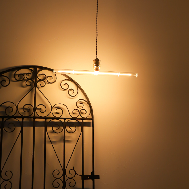 特長ユニークなT字の筒型デザイン約W50cmのワイドサイズ。直径φ3cmのスリムな形状で、壁付けブラケットや1灯用吊り下げ照明器具に取り付ければ、一気にモダンな雰囲気に。170度回転構造口金上のパーツ部分が約170度回転するので、照明器具に取り付けたあとでも電球の向きを微調整可能。壁付け・縦付け・斜め付けなど多様な設置スタイルに対応でき、店舗演出やインテリアデザインの自由度が広がります。暖かみのある電球色色温度2,000Kのやわらかな光。眩しさを抑え、落ち着いた空間演出に最適です。カフェ風インテリアやヴィンテージ調はもちろん、北欧風・ナチュラル・モダン・インダストリアル・ミッドセンチュリー・レトロ・ホテルライク・韓国風など幅広いインテリアテイストにマッチ。調光器対応位相制御式のLED専用調光器に対応。シーンに合わせて光の明るさを調整可能です。
