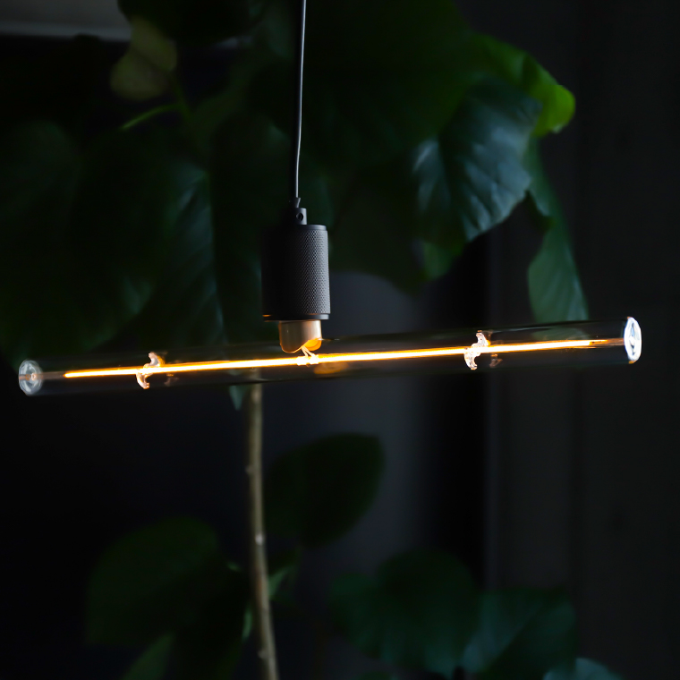おしゃれでユニークな演出照明をお探しの方へ。「エジソンバルブLED」シリーズから登場した横長チューブ型のLED電球は、シンプルながらも存在感のあるデザイン。真っすぐ伸びた直線のLEDフィラメントがどこか無骨でクールな雰囲気を演出するかっこいいLEDランプです。裸電球スタイルでありながら、個性的なフォルムの電球は、カフェ・ショップ・バーなどの店舗照明や、リビング・寝室の間接照明やアクセント照明にもぴったりです。
