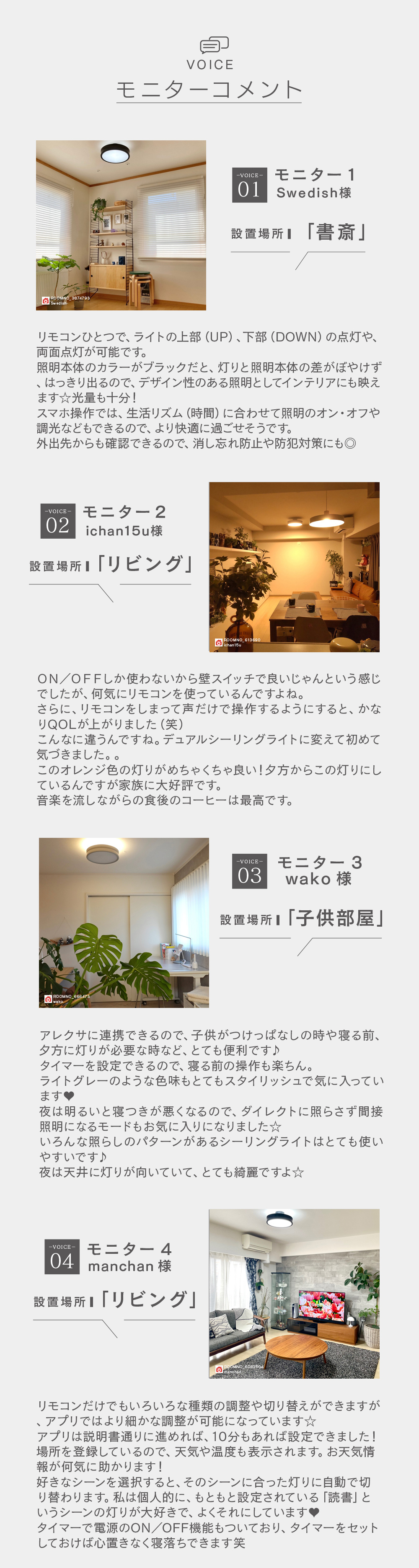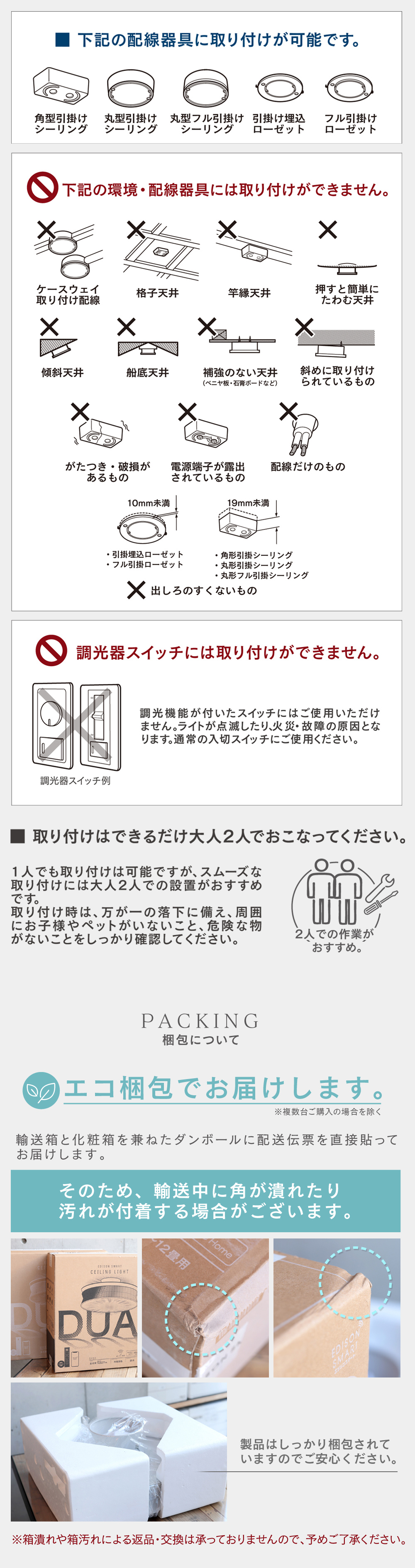 | 備考 | ※壁スイッチなどからのオンオフ操作も可能ではありますが、デバイスがリセット状態に戻る(点滅状態になる)ことがございますので、壁スイッチでの操作はなるべくお控えください。 ※この製品・アプリは日本国内専用です。海外ではご使用になれません。 ※交流100V、周波数50/60Hz以外での電源では使用しないでください。 ※引掛けシーリング専用ですが、別売りのダクトレール変換プラグを使用すれば、ダクトレールにも取り付け可能です。 ※調光器スイッチには使用しないでください。 ※LEDですが点灯中や消灯直後は器具が高温になります。触らないようにご注意ください。 ※付属のリモコンは、製造年が2024年以前の旧タイプにはご使用いただけません。 ※製品の設置に関わる工事費、点灯の不具合に伴い発生する費用、二次的損害(設置納期遅延、施工費、人件費、業務に支障が生じた際の損失等)など一切の責任を負いかねますので予めご了承ください。 その他取扱説明書をよくお読みの上ご使用ください。 |