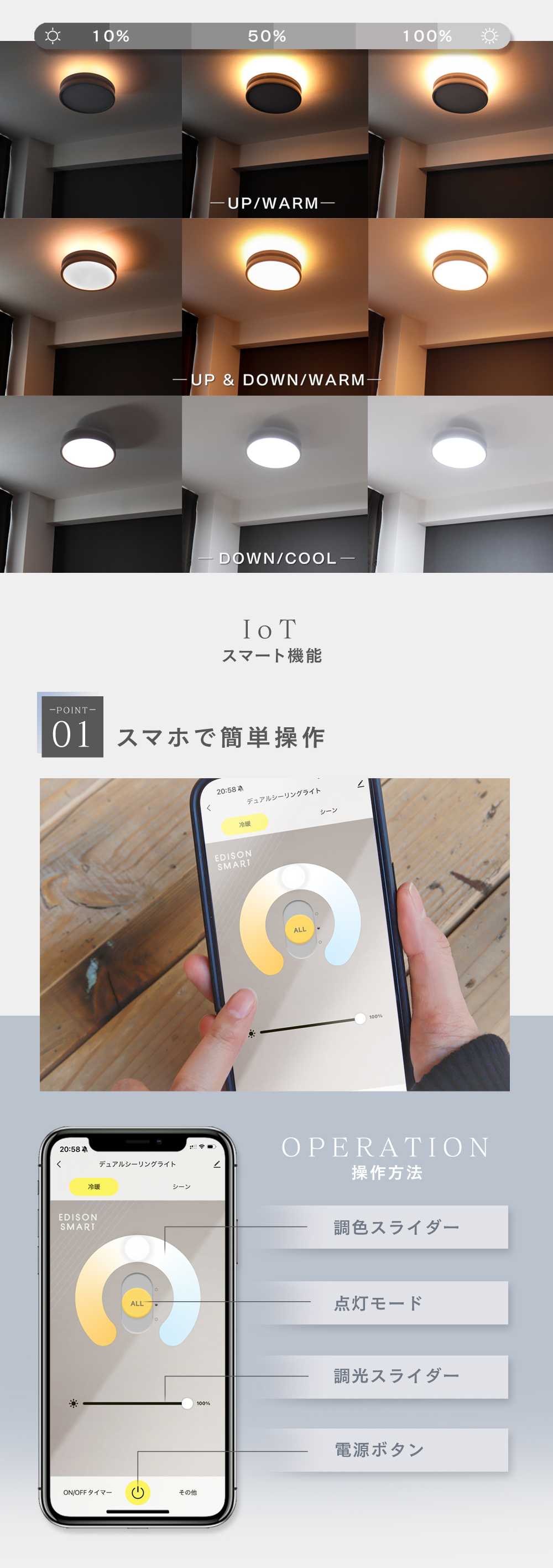 写真をもっと見る■便利なスマート照明【1】スマートフォンやタブレットで操作専用アプリ「Edison Smart」をスマホやタブレットにダウンロードすれば照明のリモコンに!電源のON/OFFや調光調色はもちろん、様々な機能が使えます。【2】音声でライトを操作Amazon Alexa、Google Homeのスマートスピーカーと連携すれば、声だけで照明の操作が可能です。また、iPhoneを使ってSiriからも操作可能です。(設定した「シーン」の操作のみ)