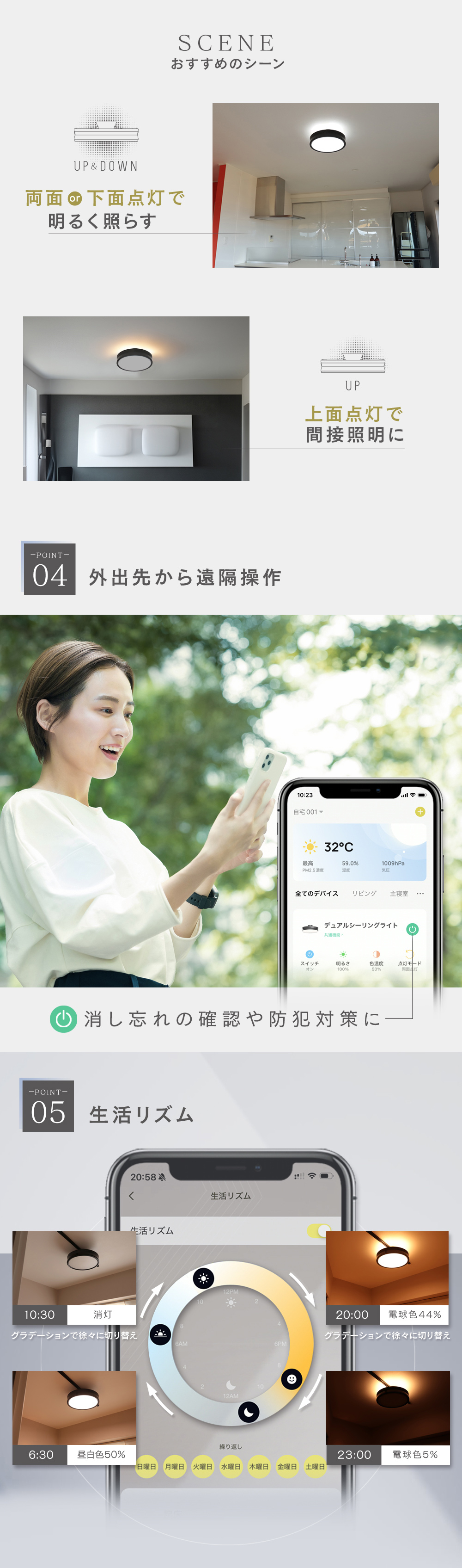 ※上面・両面・下面の点灯モードの切り替えを音声でおこなう場合は、まずエジソンスマートアプリで点灯モードの「シーン」を作成して、「『シーン名』をONにして」という音声コマンドで操作してください。【3】タイマー、自動化設定スケジュールによる自動化や、好きな明るさ・色に設定して ワンタップで操作できるシーン設定が可能。