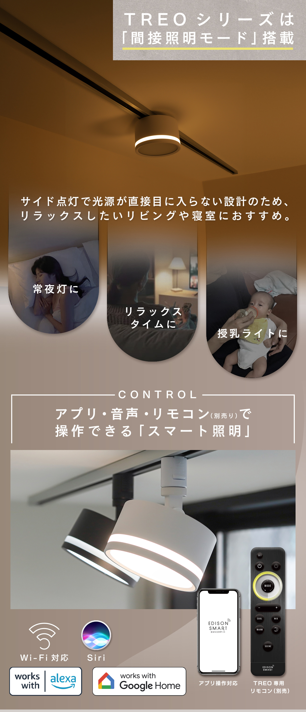 ■便利なスマート照明【1】スマートフォンやタブレットで操作専用アプリ「Edison Smart」をダウンロードすると、スマホやタブレットが照明のリモコンに!電源のON/OFFや調光調色はもちろん、様々な機能が使えます。【2】音声でライトを操作Amazon Alexa、Google Homeのスマートスピーカーと連携すれば、声だけで照明の操作が可能です。