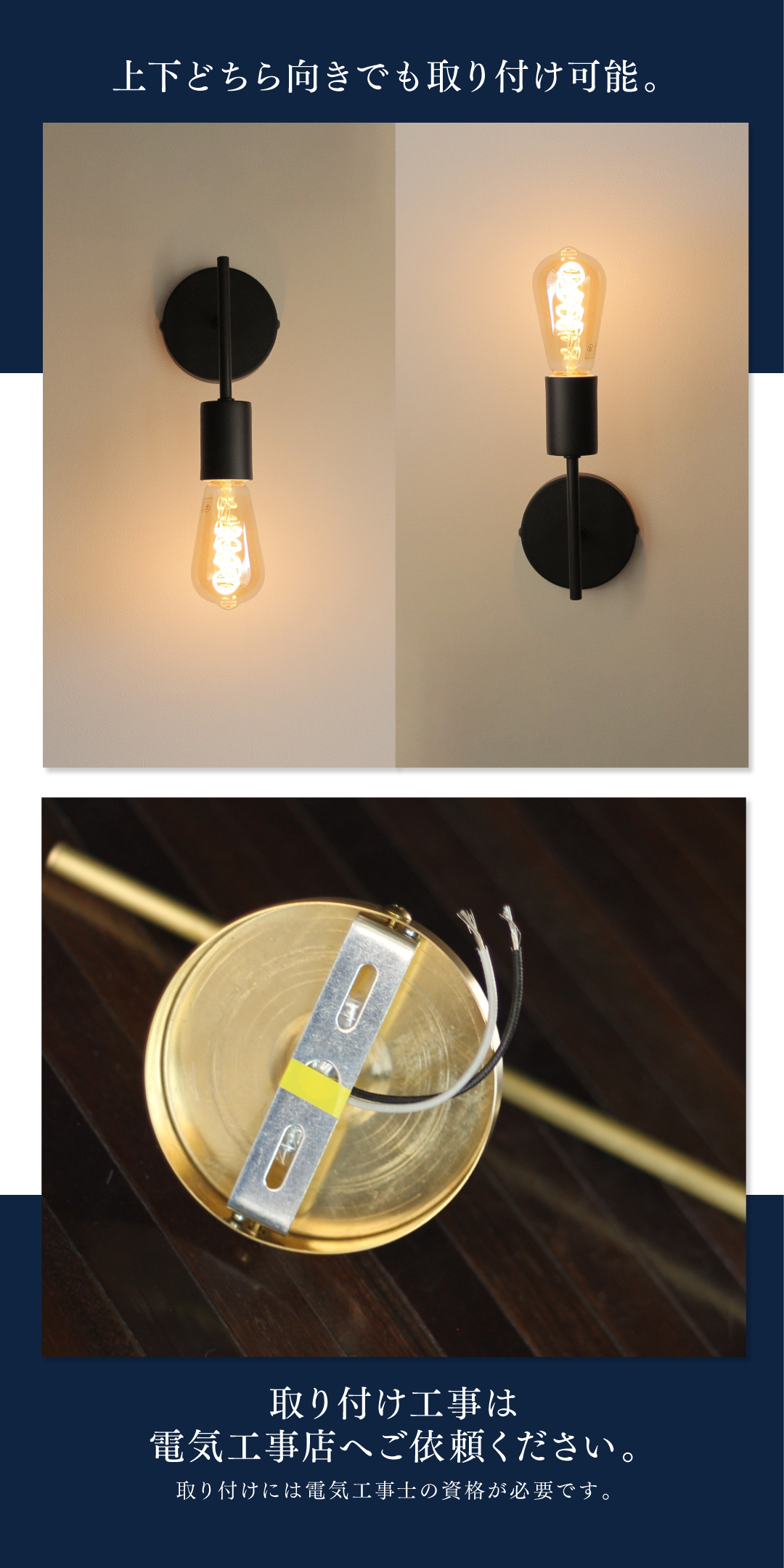 | 仕様 | 口金:E26 定格電圧:AC100V 対応電球:LED電球・白熱電球 消費電力25Wまで 取り付け方法:壁付け ※壁付け専用照明器具です(埋め込み配線)。取付けは必ず電気工事店にご依頼ください。 ※照明器具にはスイッチは付いておりません。壁スイッチをご使用ください。 ※電球は付属しておりません。 |
