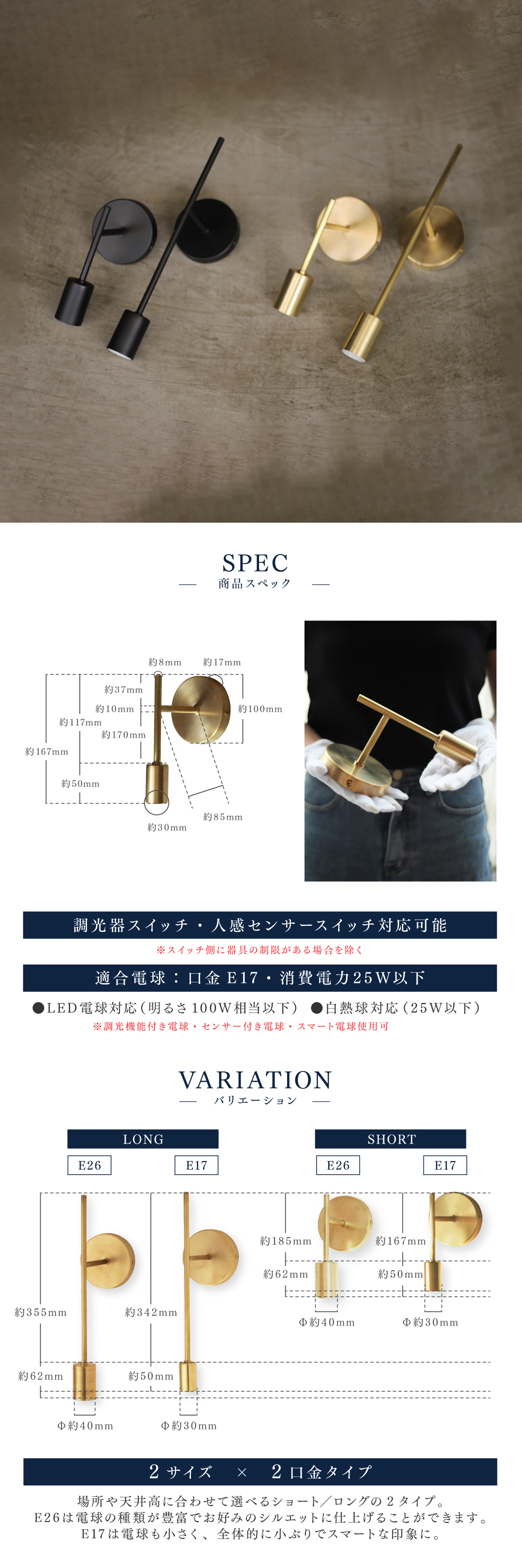 ショートタイプは支柱も短めな小ぶりのデザインで、天井の低い空間や小スペースの間接照明に。内玄関・廊下・階段・寝室・洗面所・トイレ・ニッチ・カウンター横など、「空間のバランスを崩さず、さりげなく光を添えたい場所」に最適な壁付けライトです。