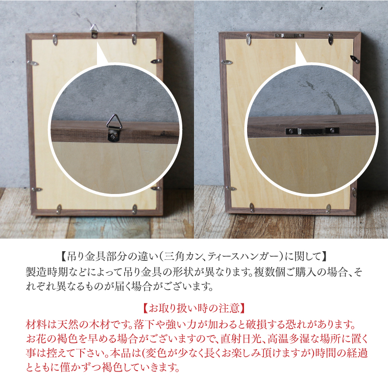 【ご購入前に】 ●材料の木材は天然木を使用しているため、それぞれ風合いが異なり、多少の傷などがある場合がございます。 ●材料のお花は、季節や入荷状況により異なります、お花のリクエストにはお答えできかねます。 ●ドライフラワーはデリケートなため、輸送中に葉や花びらに多少の千切れや剥離、こぼれが生じる事がございます。 ●製造時期などにより吊り金具の形状(三角カン、ティースハンガー)が異なります。複数個ご購入の場合、それぞれ異なるものが届く場合がございます。