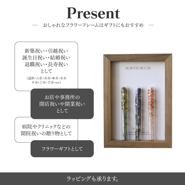 おしゃれなフラワーフレームはギフトにもおすすめ。