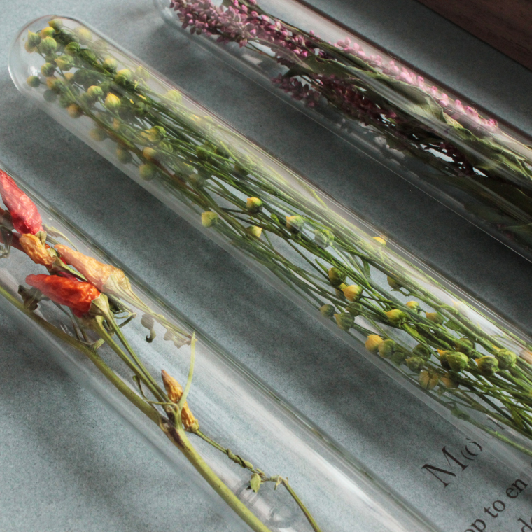 ガラスの試験管にドライフラワーをあしらったタイプです。