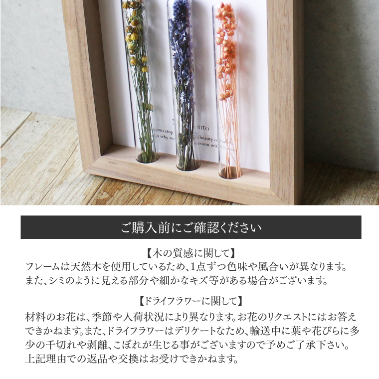 | 注意事項 | ●容器はガラス製の試験管です。落下や強い力が加わると破損する恐れがあります。 ●材料は天然の木材です。落下や強い力が加わると破損する恐れがあります。 ●お花の褐色を早める場合がございますので、直射日光、高温多湿な場所に置くことは控えて下さい。 ●本品は(変色が少なく長くお楽しみ頂けますが)時間の経過とともに僅かずつ褐色していきます。