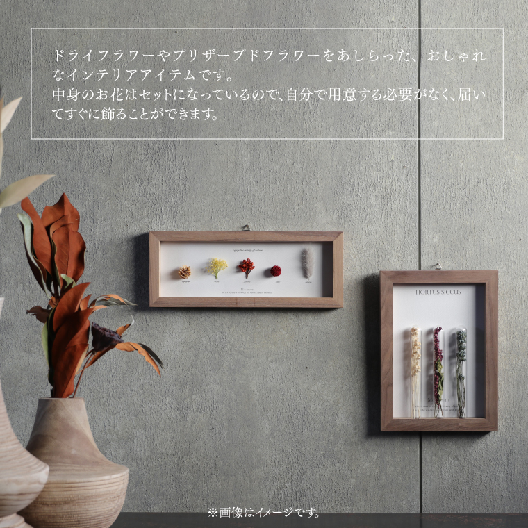 ドライフラワーやプリザーブドフラワーをあしらった、おしゃれなインテリアアイテムです。