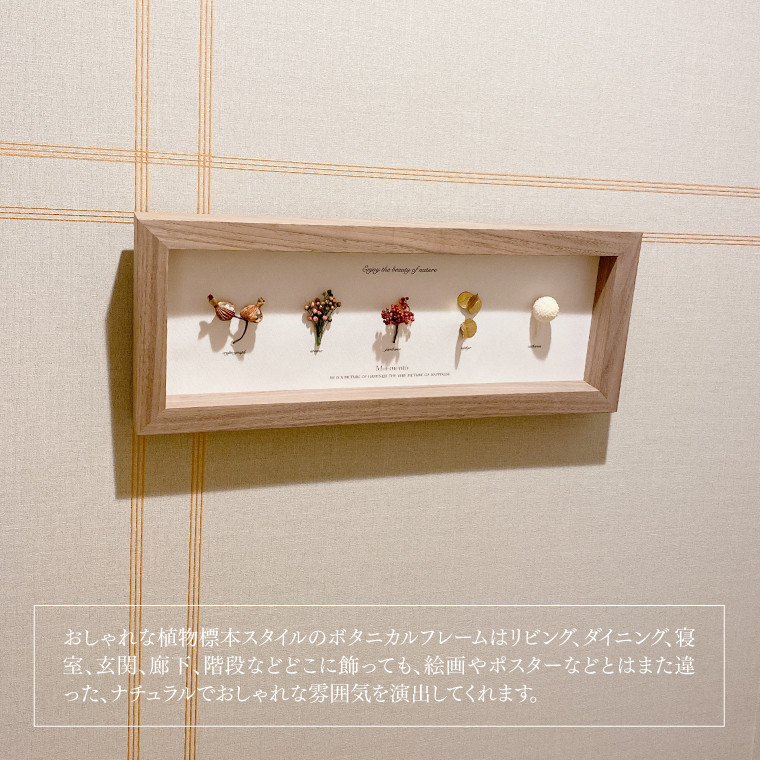 おしゃれな植物標本スタイルのボタニカルフレームはリビング、ダイニング、寝室、玄関、廊下、階段などどこに飾っても、絵画やポスターなどとはまた違った、ナチュラルでおしゃれな雰囲気を演出してくれます。
