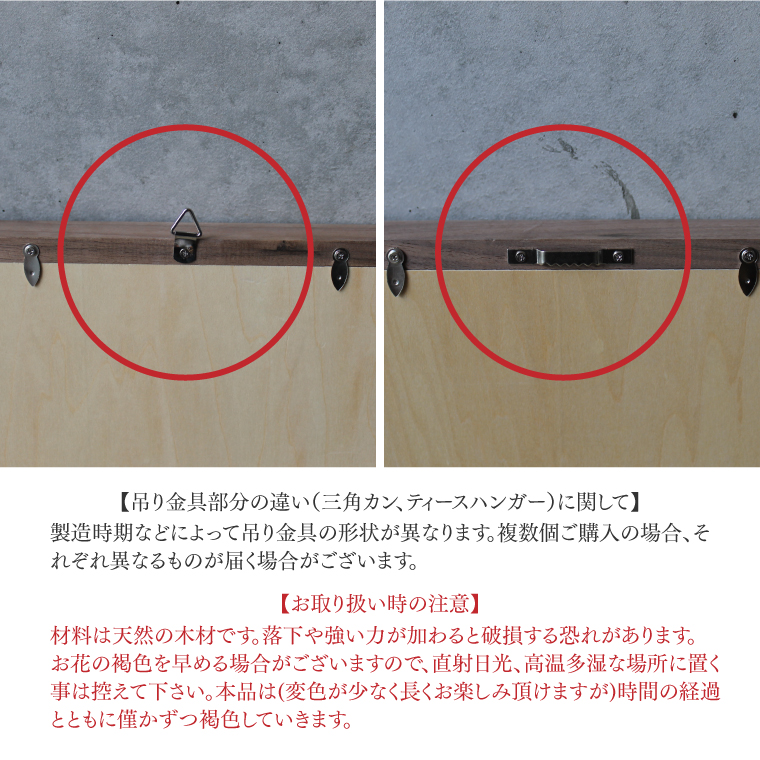【ご購入前に】 ●材料の木材は天然木を使用しているため、それぞれ風合いが異なり、多少の傷などがある場合がございます。 ●材料のお花は、季節や入荷状況により異なります、お花のリクエストにはお答えできかねます。 ●ドライフラワーはデリケートなため、輸送中に葉や花びらに多少の千切れや剥離、こぼれが生じる事がございます。 ●製造時期などにより吊り金具の形状(三角カン、ティースハンガー)が異なります。複数個ご購入の場合、それぞれ異なるものが届く場合がございます。