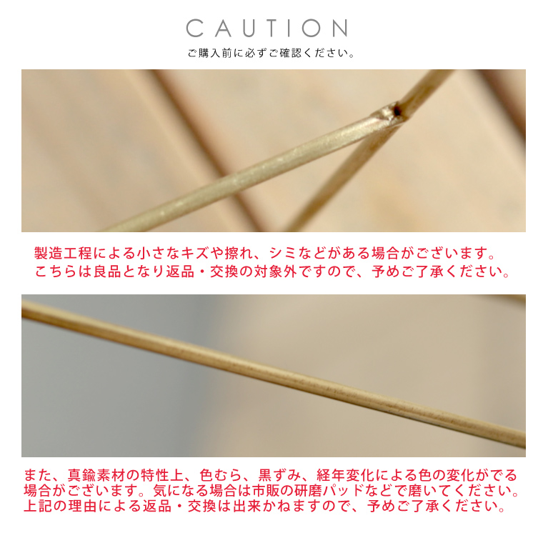 | ご使用上の注意 | 【真鍮パーツについて】 製造工程による小さなキズや擦れ、シミなどがある場合がございます。こちらは良品となり返品・交換の対象外ですので、予めご了承ください。また、真鍮素材の特性上、色むら、黒ずみ、経験劣化による色の変化がでる場合がございます。気になる場合は市販の研磨パッドなどで磨いてください。 上記理由による返品・交換は出来かねますので、予めご了承ください。 |