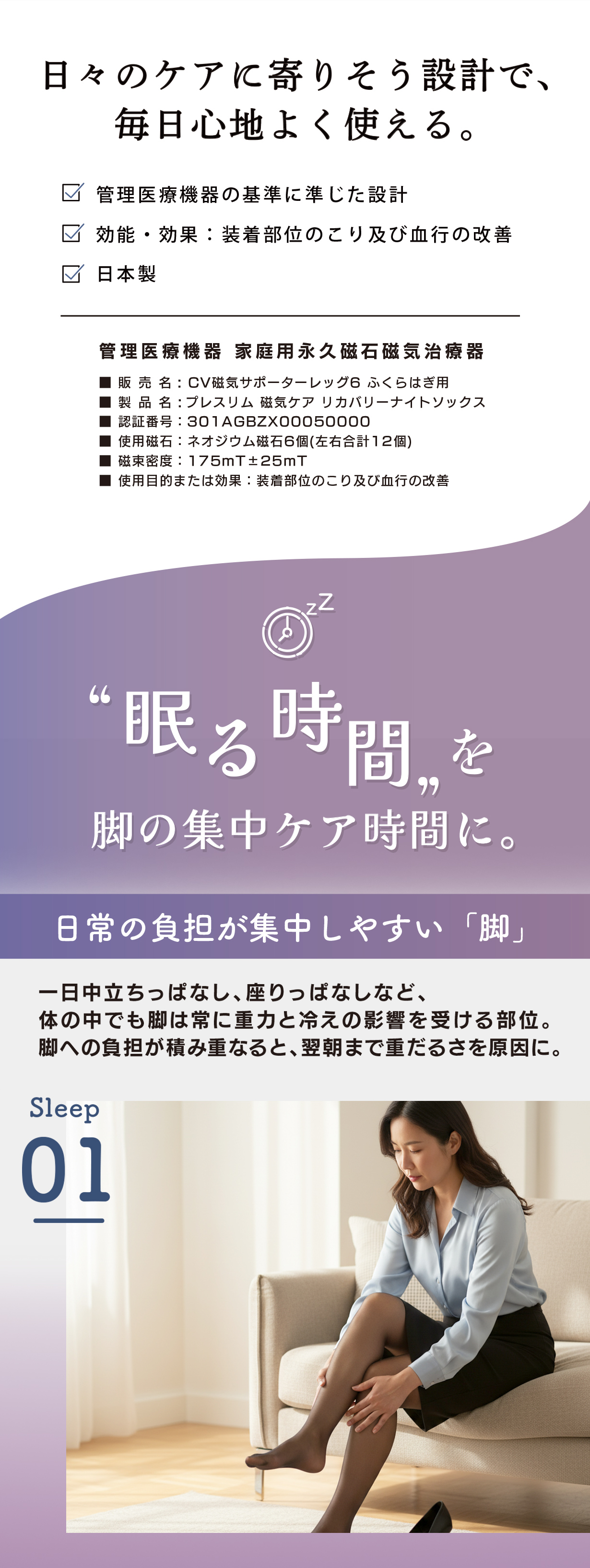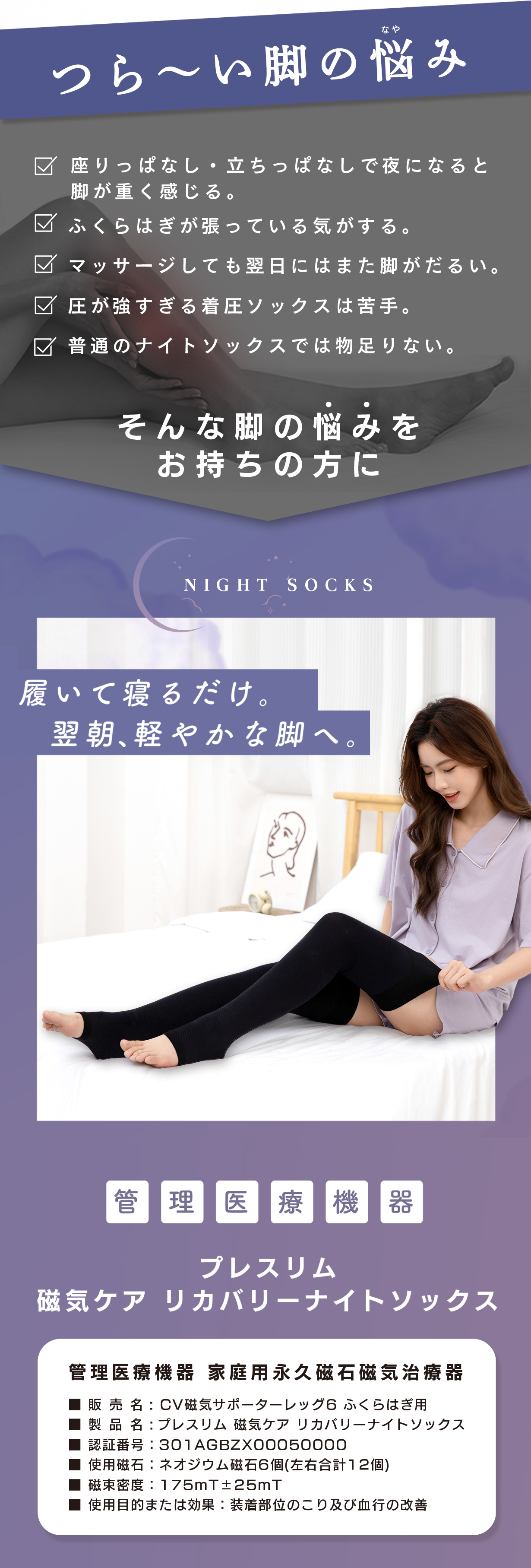 眠っている間にしっかりケアしたい方、翌朝の脚を軽やかに迎えたい方におすすめの管理医療機器ニーハイソックスです。