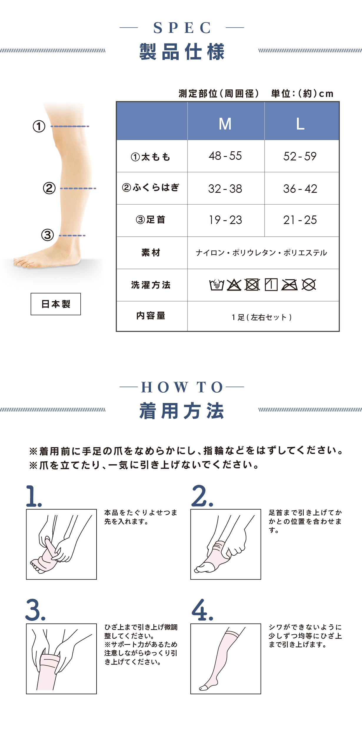 | サイズ | Mサイズ/太もも:約48-55cm ふくらはぎ:約32-38cm 足首:約19-23cm Lサイズ/太もも:約52-59cm ふくらはぎ:約36-42cm 足首:約21-25cm |