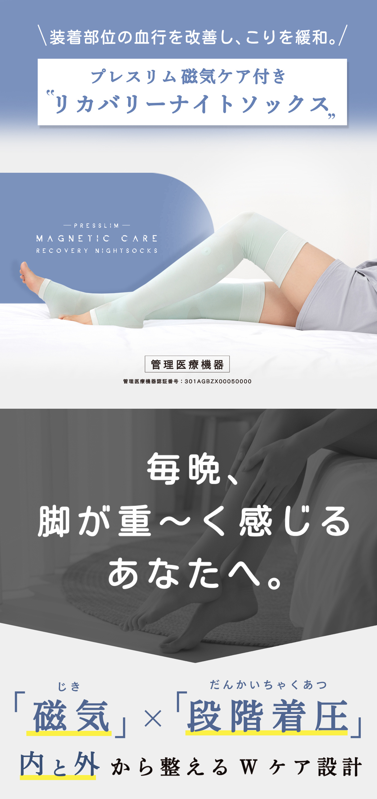 磁気×段階着圧のダブルアプローチで内側と外側から脚のコンディションを整える、Wケア設計の夜用加圧ソックスです。