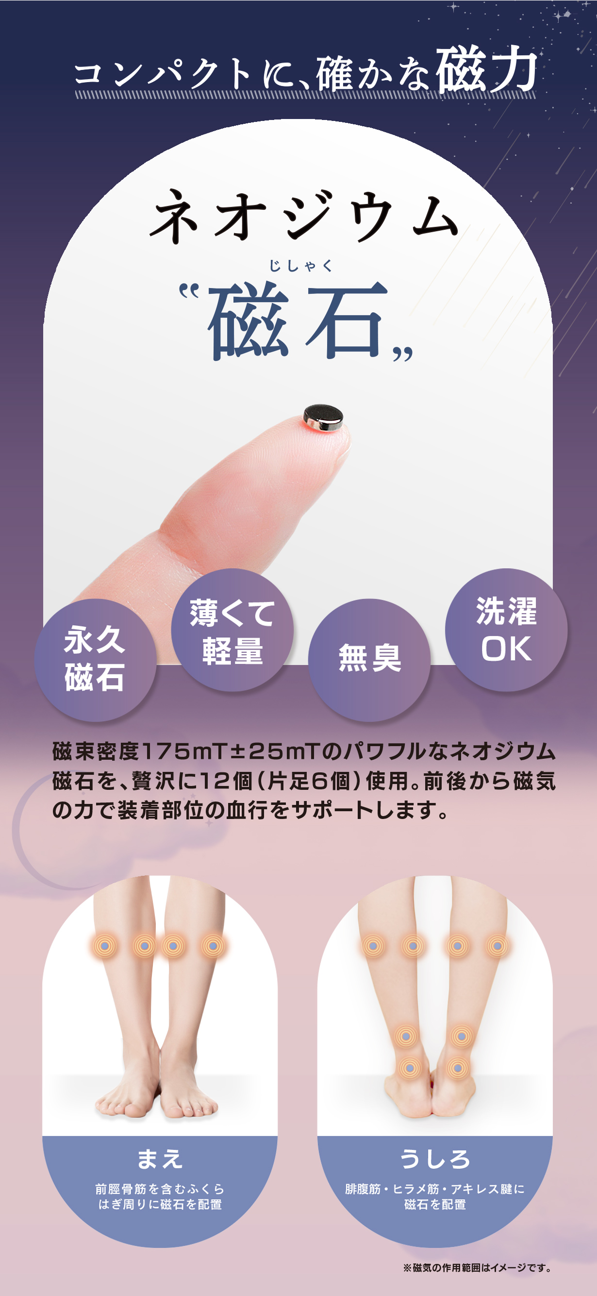 磁気ケアリカバリーソックスのFAQはこちら★贅沢に内蔵した12個のネオジウム磁石磁束密度175mT±25mTのパワフルなネオジウム磁石を、片足6個ずつ、合計12個も内蔵。