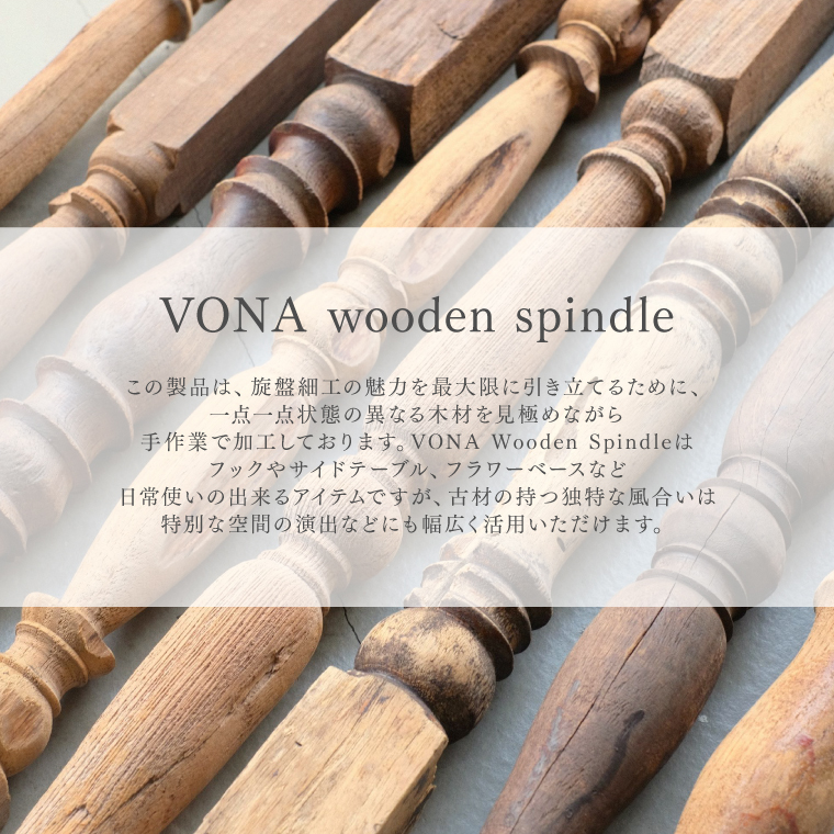 VONA Wooden Spindleはフックやサイドテーブル、フラワーベースなど日常使いの出来るアイテムですが、古材の持つ独特な風合いは特別な空間の演出などにも幅広く活用いただけます。■製品の特性本製品はアイアン素材を使用しております。アイアンならではの小さな傷、錆がある場合があります。少しずつ異なる風合いをお楽しみくださいませ。※素材の特性による傷、錆などによる返品・交換はお受けできかねます。あらかじめご了承くださいませ。