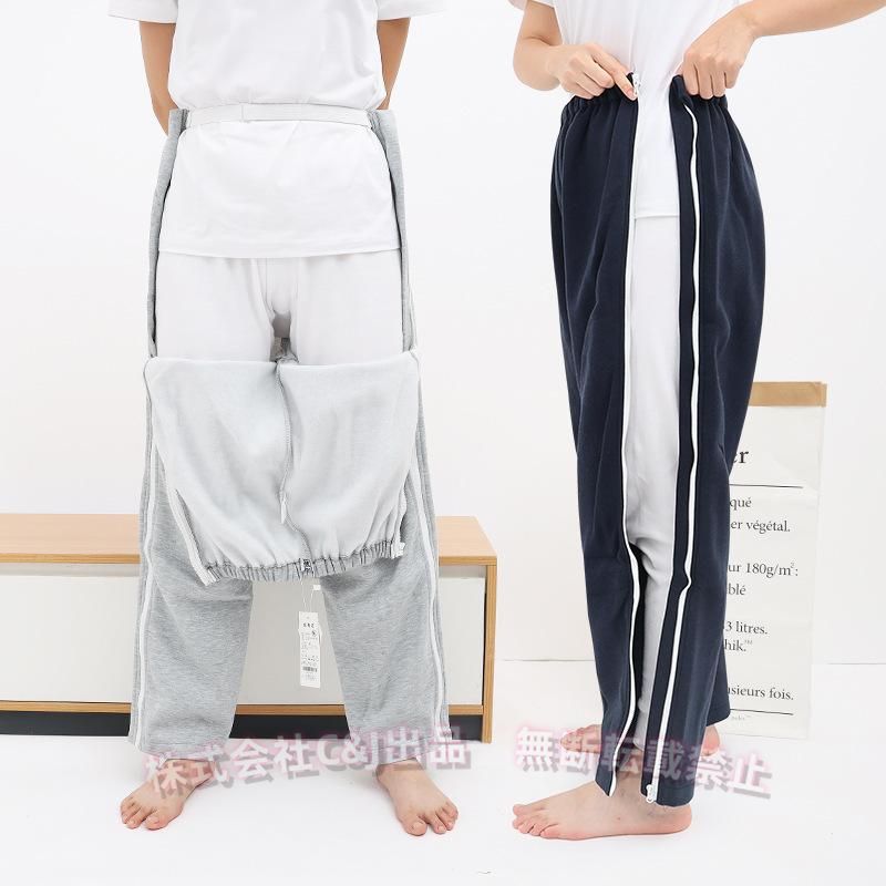 介護用 ズボン 全開フルオープン 通年用 パジャマ オムツ交換 両開き 両脇全開 寝たきり のお着替えサポート レディース M グレー