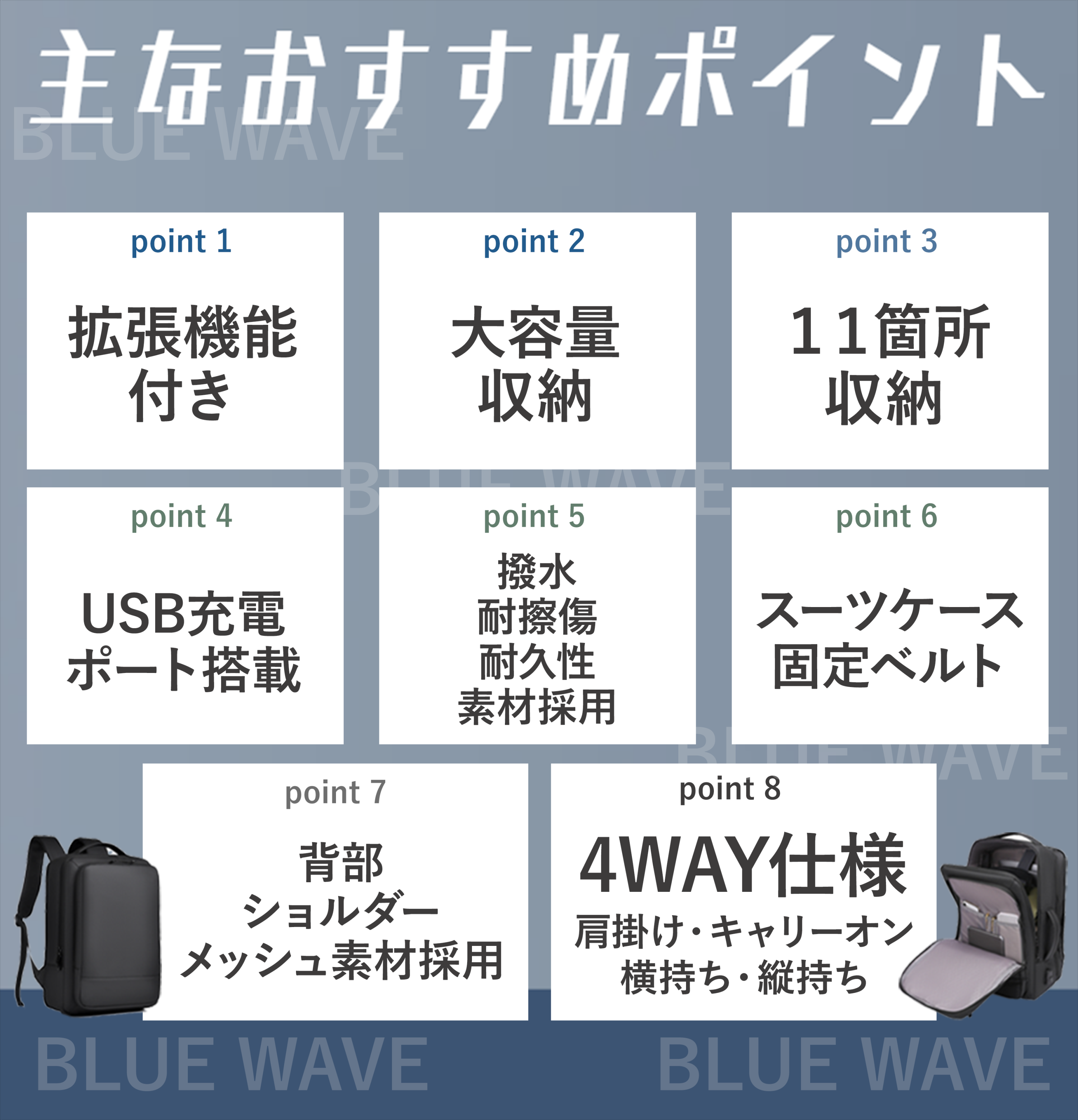 | 特徴 | 大容量/拡張/撥水/4WAY |