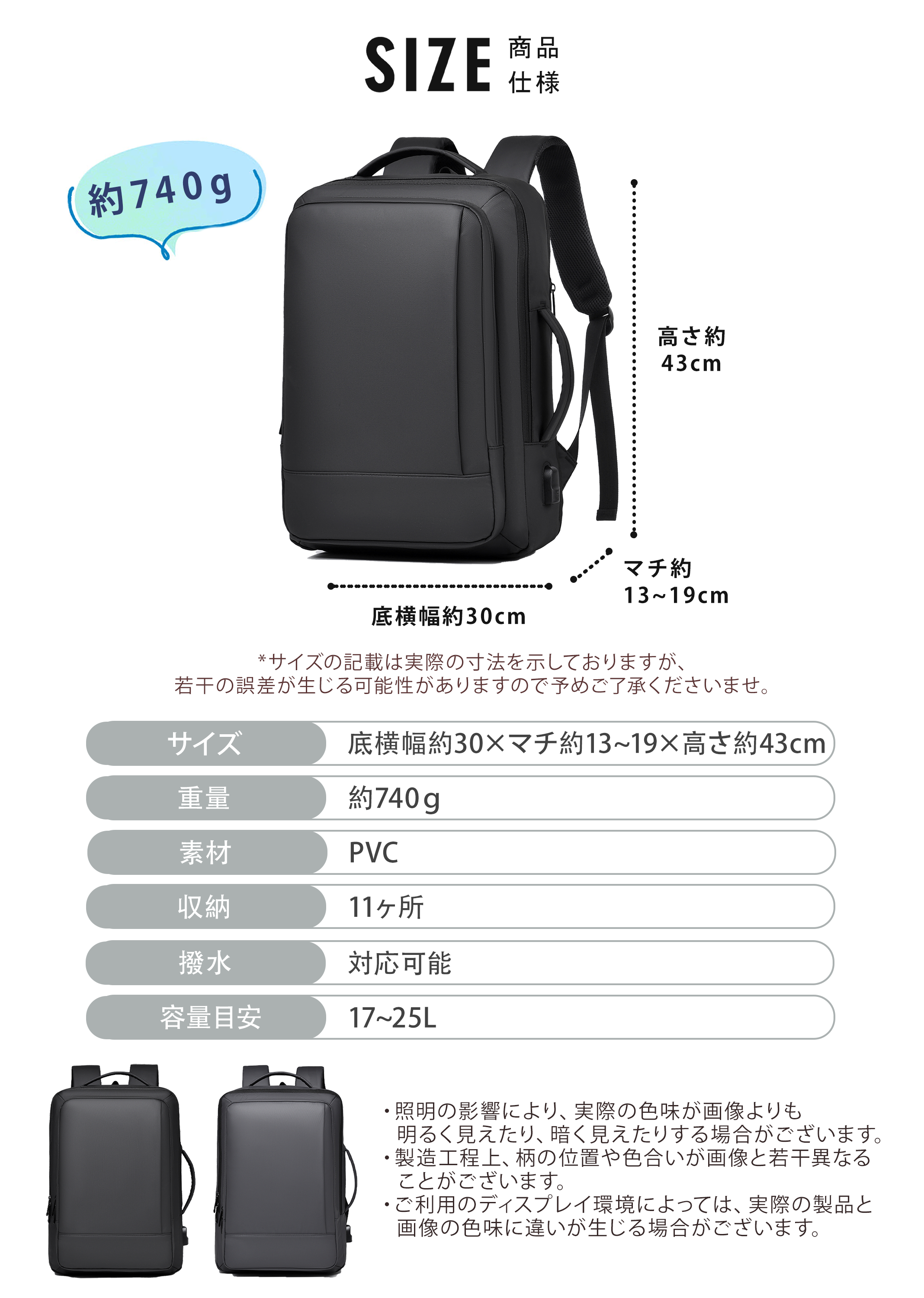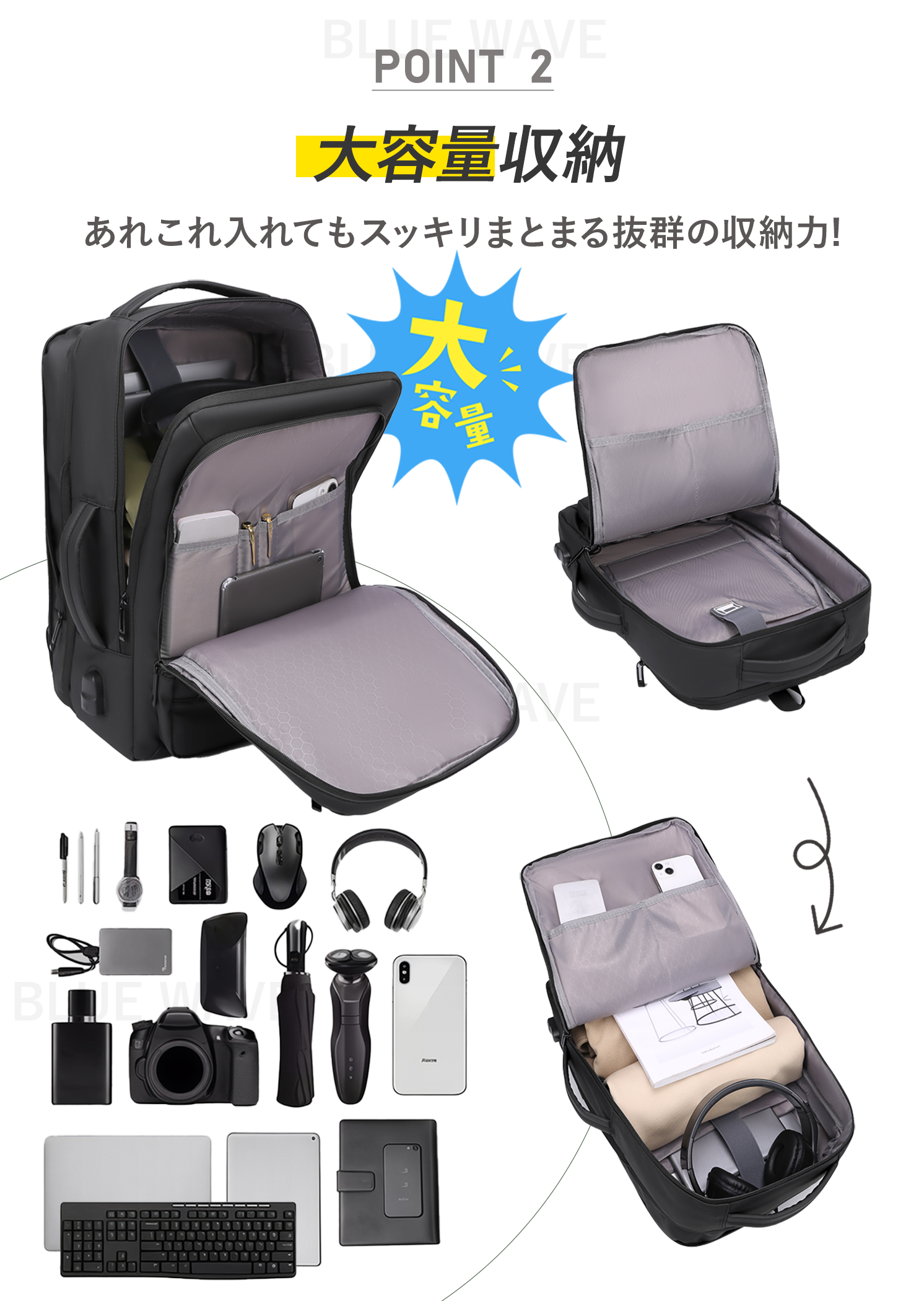 - 大容量:通勤の書類・小物から、出張・旅行の荷物までまとめたい時に。