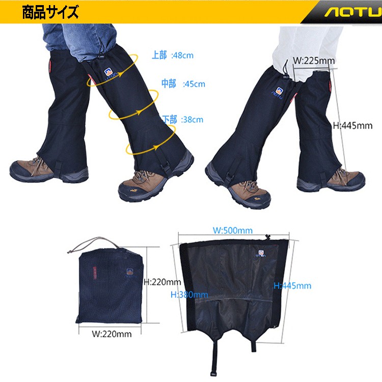 表面は撥水加工を施しているので、雨や雪の日でも安心。足元の汚れ、泥はね防止、防寒対策として。膝あたりまでカバー可能です。
