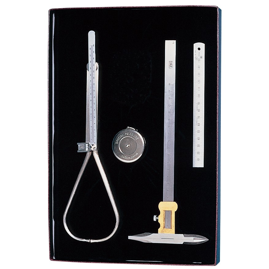 ● 滑測器(ノギス)、測径器(キャリパス)、スケール、巻き尺の4種類の測定器で構成された人体測定器のセットです。