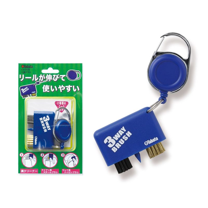 ブラシもクリーナーもこれ一つで解決! セルフプレイの強い味方、3wayブラシ約60cm伸びるリールがついているのでキャディバッグやベルトに取り付けたまま使用可能。使い勝手抜群です! ■黒色ブラシ・ナイロンブラシ・ドライバー、フェアウェイウッドにおすすめ■金色ブラシ・金属ブラシ・アイアンにおすすめ■溝クリーナー・フェースの溝についた汚れにおすすめ