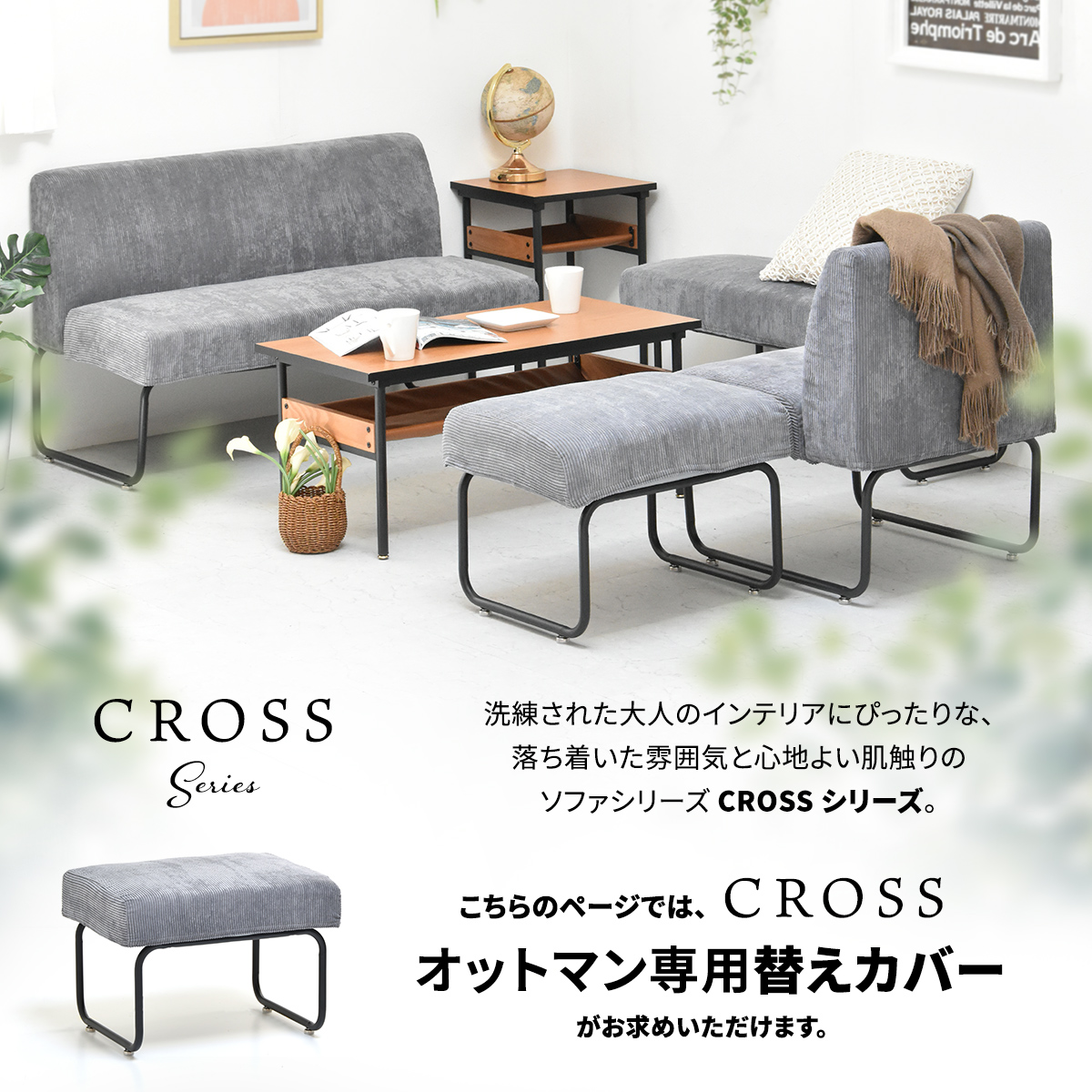 CROSSシリーズは、季節や気分に合わせてお部屋の雰囲気を変えられるカバーが掛け替え自由なソファシリーズ、こちらのページではオットマン専用替えカバー(単品)がお求めいただけます。 |