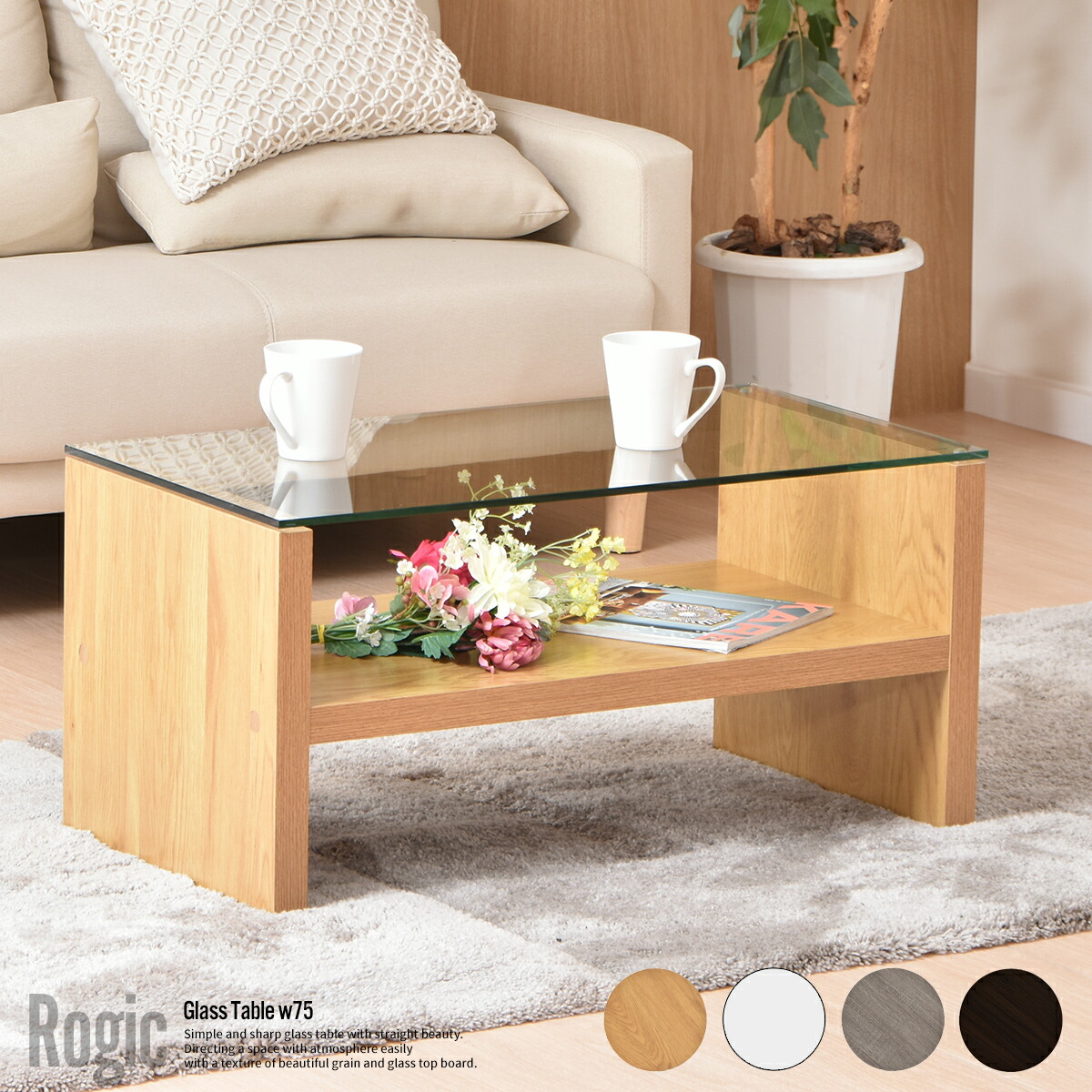 シンプルなデザインなのでどんなお部屋にも違和感なくマッチするガラステーブル。天板には8mmの強化ガラスを使用、中にいれたものが見えるのでディスプレイとしても使えます。色はホワイト、ナチュラル、ブラウン、グレーの4色を用意。