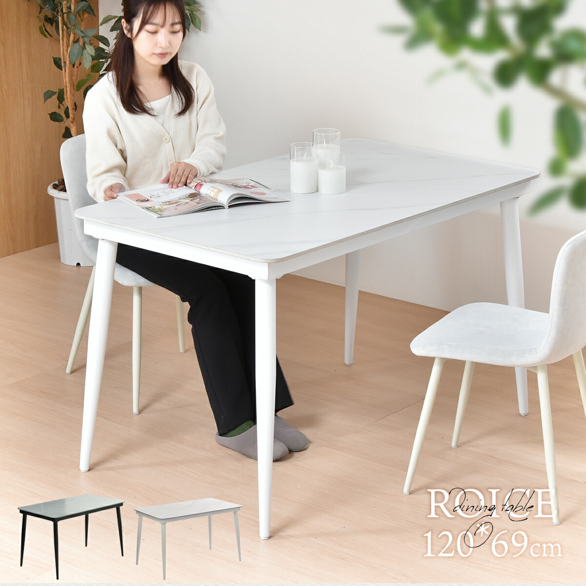 大理石調セラミック天板のダイニングテーブル(幅120cm)です。天板がセラミックなので耐火耐熱・表面硬度・防水など機能性は抜群です。セラミックは熱に強く、熱いお鍋などを直接置いても変色、変形なく、またキズにも強いので天板をまな板代わりに使ってもキズがつきません。お手入れも簡単で食材や油などの汚れが染み込むことがなく、さっと拭いてお手入れができます。高級感のある大理石風セラミックは、白地にグレーの流れ模様が入る大理石の定番カラーのホワイト、石目調の地色にランダムで線状・帯状の柄の入るライトグレーの二色展開。主張しすぎない落ち着いた色目で、お部屋を高級感ある雰囲気に格上げします。 |