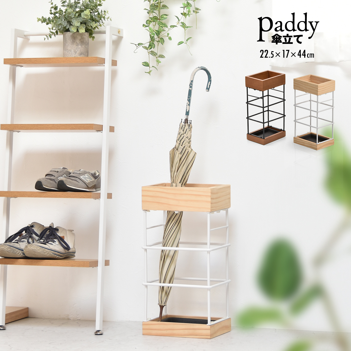 シンプルでスタイリッシュなアイアンとパインのアンブレラスタンド。傘が広がりすぎないガイド付きで、倒れ過ぎずすっきり収まる技ありのフレーム設計。内側にはプラスチックの水受けトレー付きで汚れたらさっと丸洗いできて衛生的。清潔感のあるデザインでいろんなテイストのインテリアに馴染みます。 |
