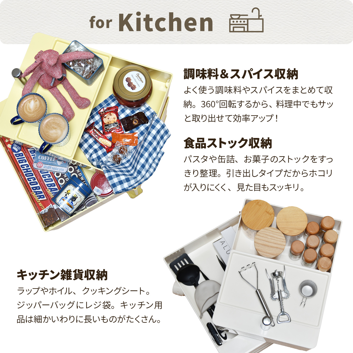 360度スピンでスライドする引き出しでどちらの方向からでもサッと取り出せます。