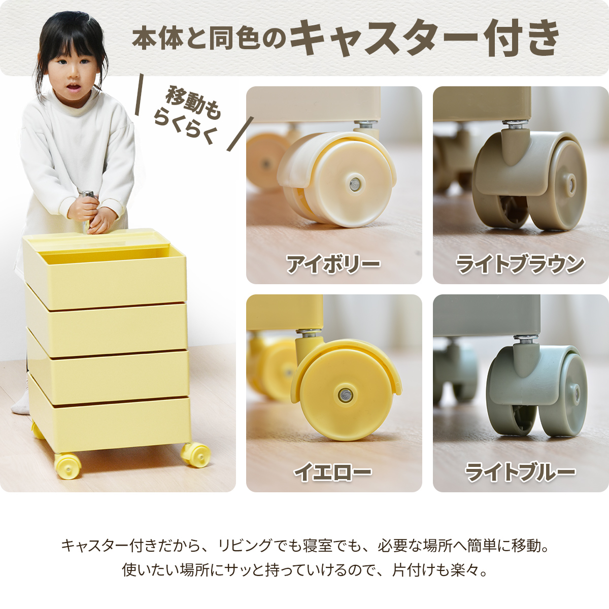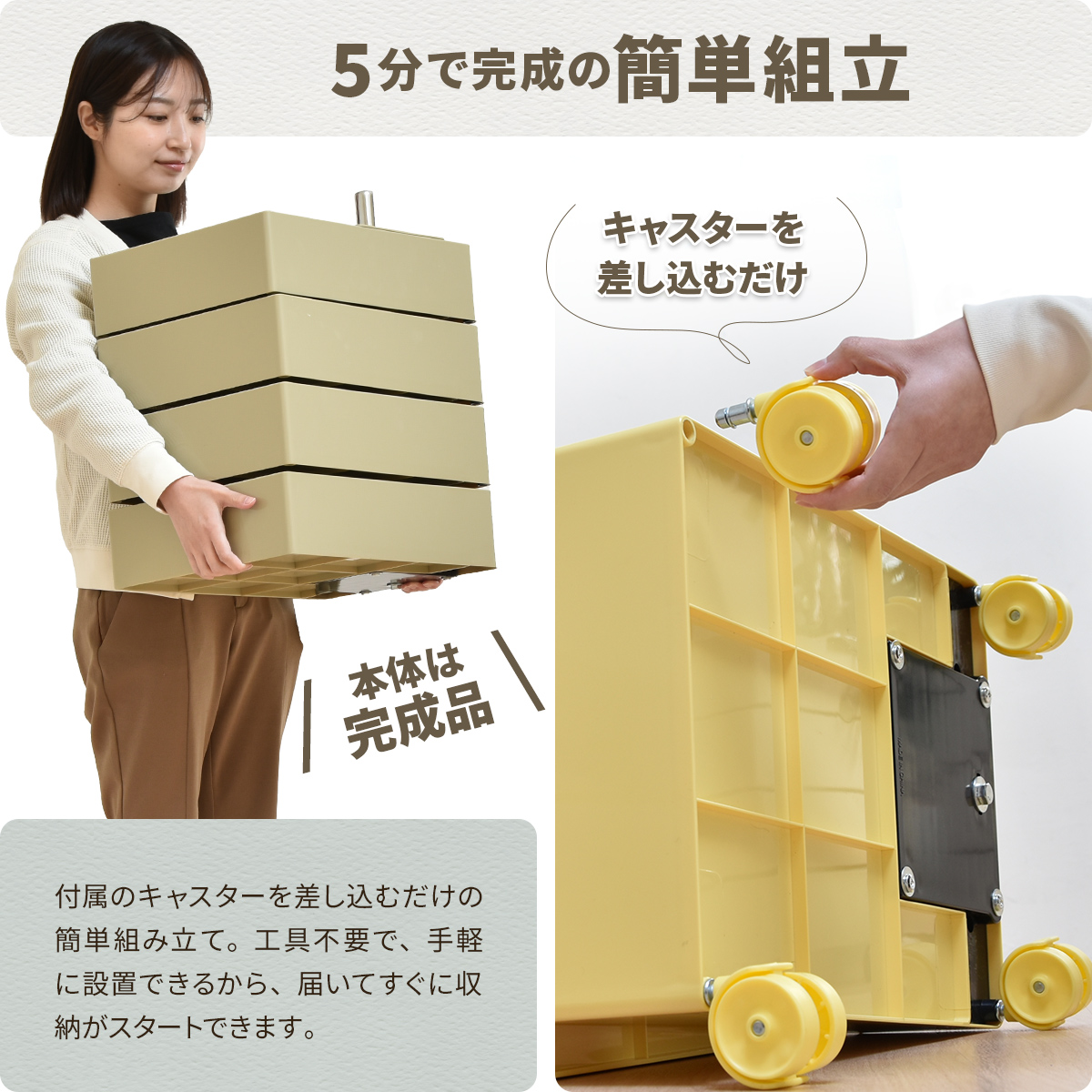 届いたらすぐに使える!キャスターを差し込むだけの簡単組み立て。工具不要で、手軽に設置できるから、届いてすぐに収納がスタートできます。