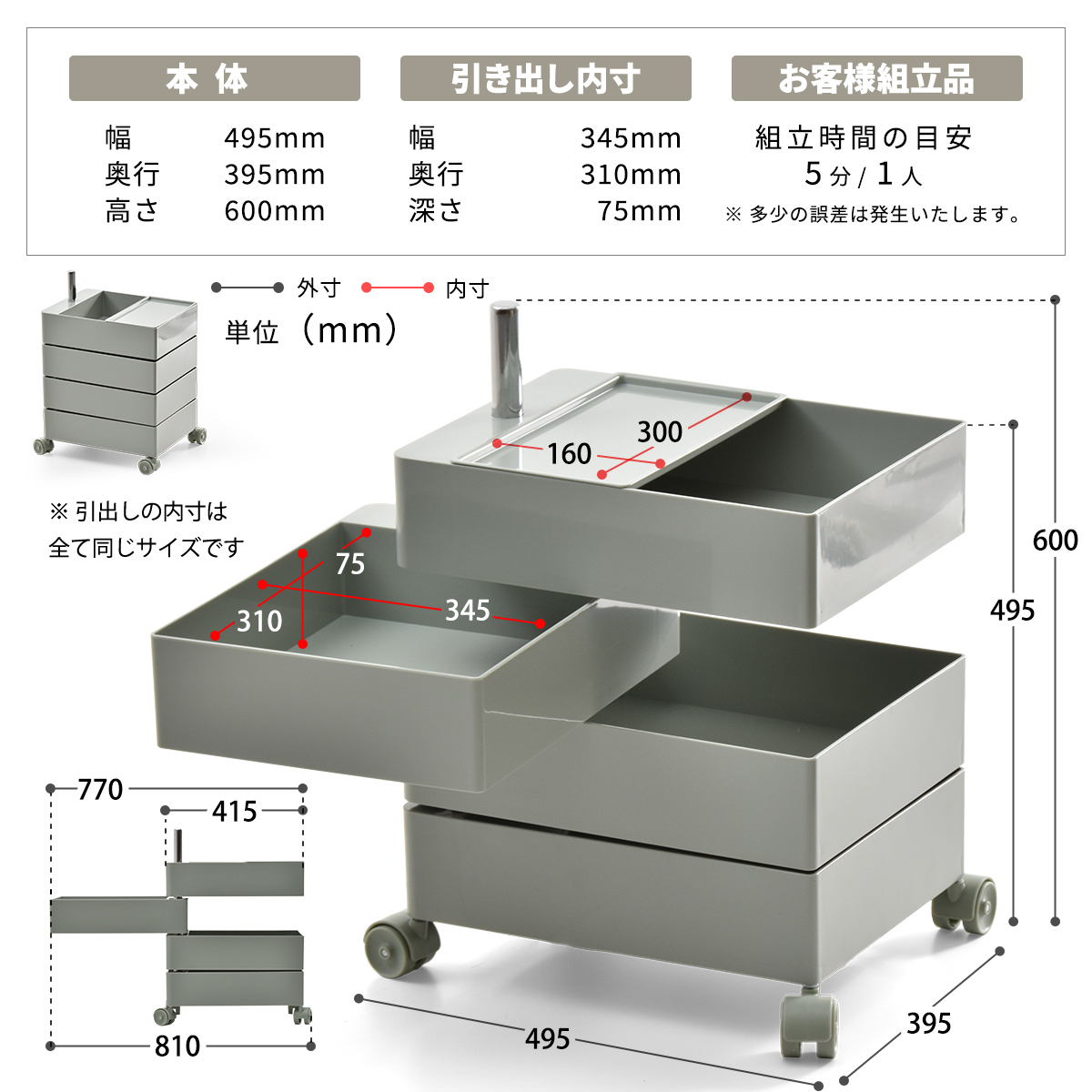 ■サイズ: 幅 495 × 奥行 395 × 高さ 600 mm ■素材: 【本体】ABS樹脂 【支柱】スチールパイプ(クロムメッキ塗装) ■商品重量: 7kg ■耐荷重: 引出:5kg(1杯) トレイ:2kg=全体22kg ■仕様: 半完成品 本体部分は完成品ですが、キャスターだけの取り付けです。 |