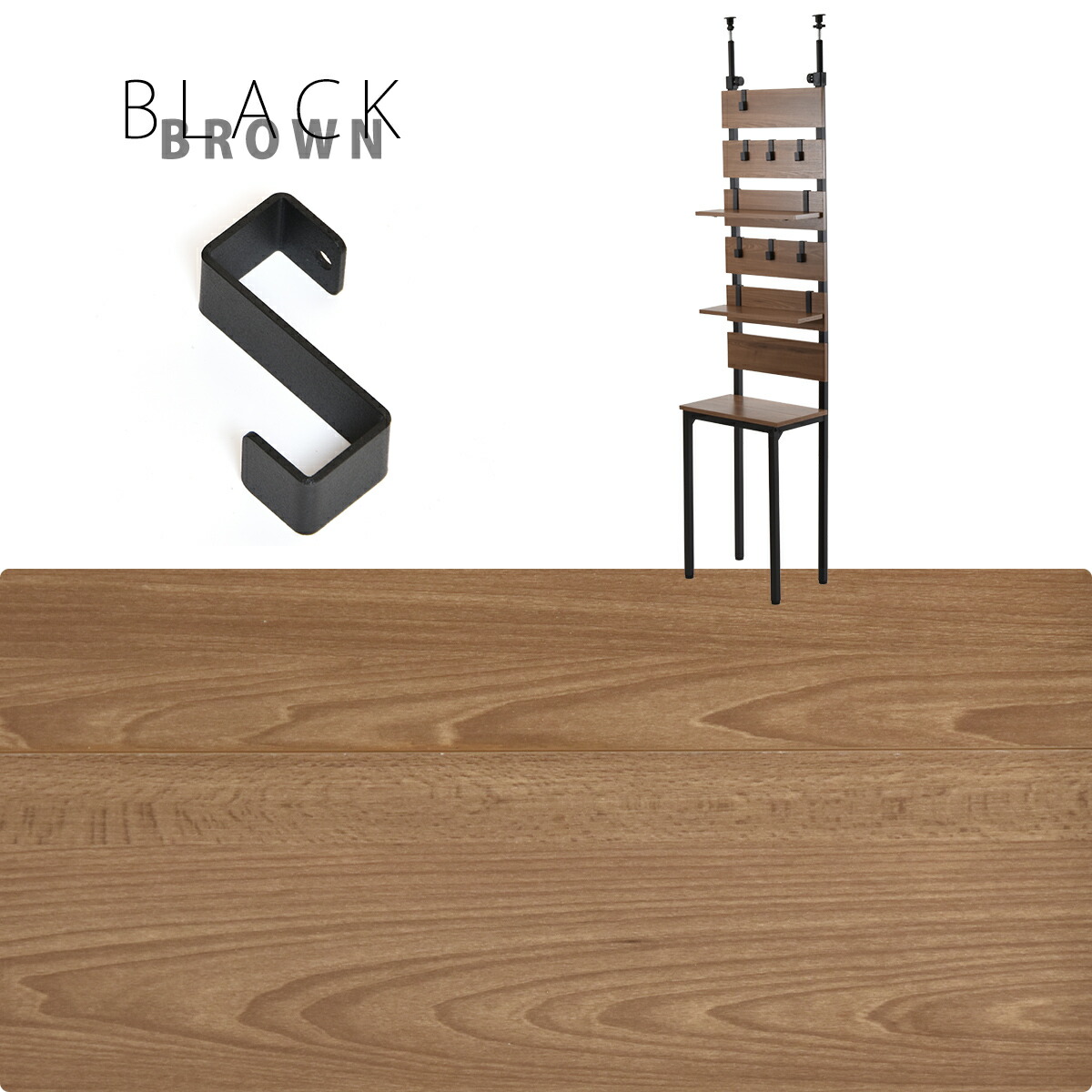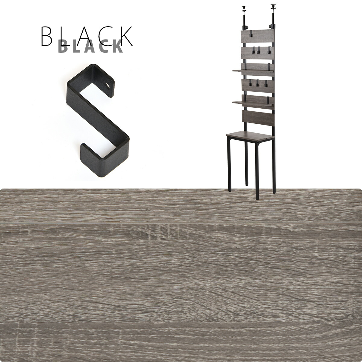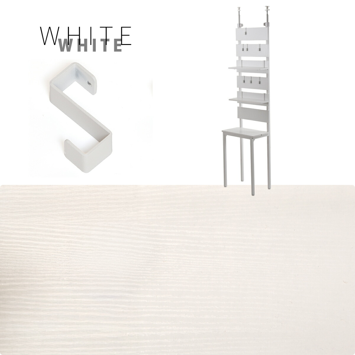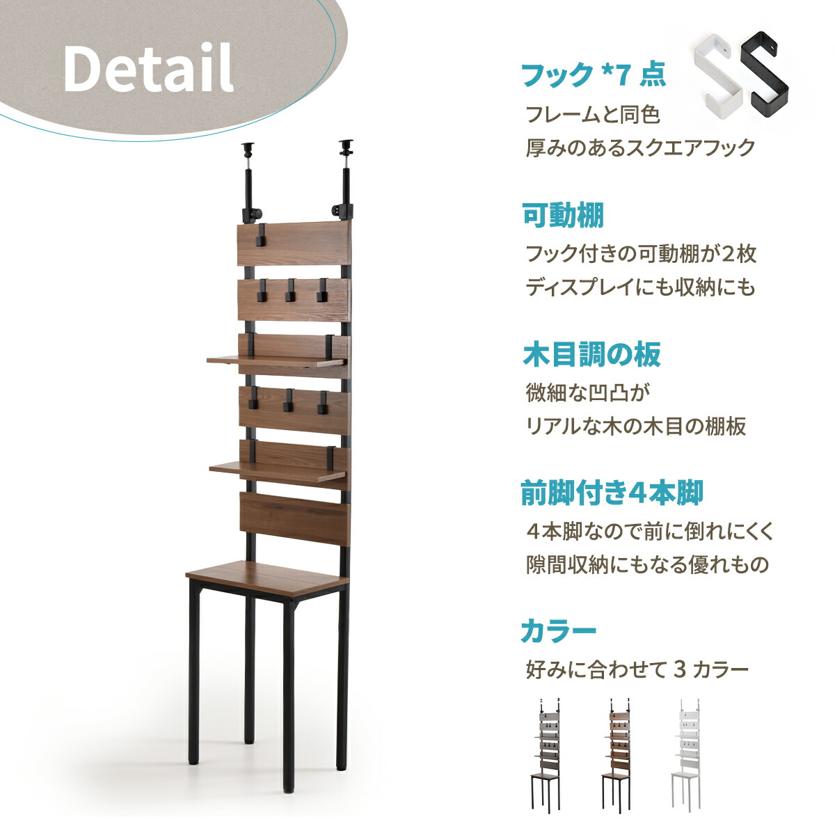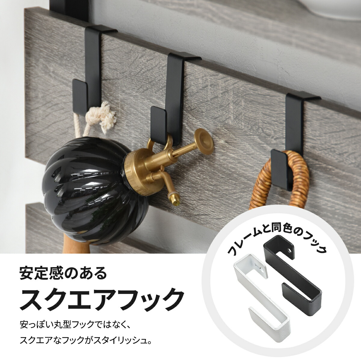パネルに直接引っ掛けられる専用フックは、鞄や取っ手付きの収納、小物が引っ掛けられる優れもの。