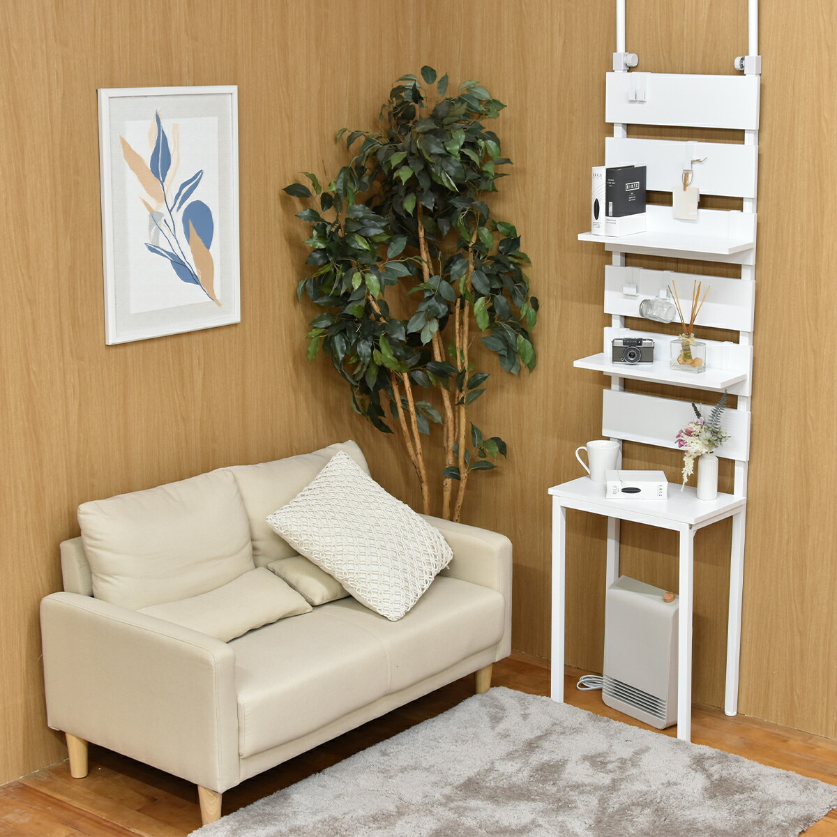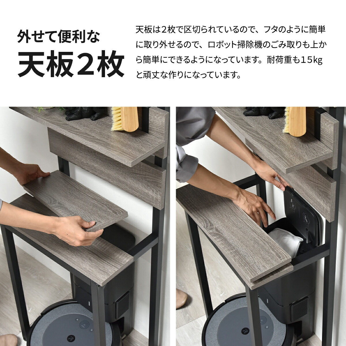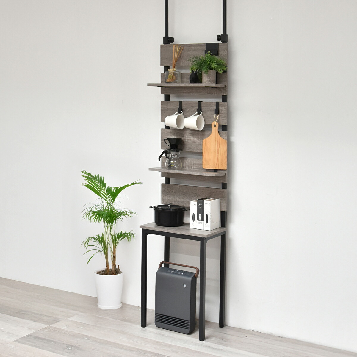 意外となかった、壁面ラックの変化形商品!お掃除ロボや石油ファンヒーターなどの上には物が置けずにデッドスペースになりがちな悩みを解消する壁面収納ラックです。脚の上に置かれた棚板は取り外し式になっているため、上からお掃除ロボのごみの回収もできて便利。意外となかった機能的に変化した壁面収納ラックです。 |