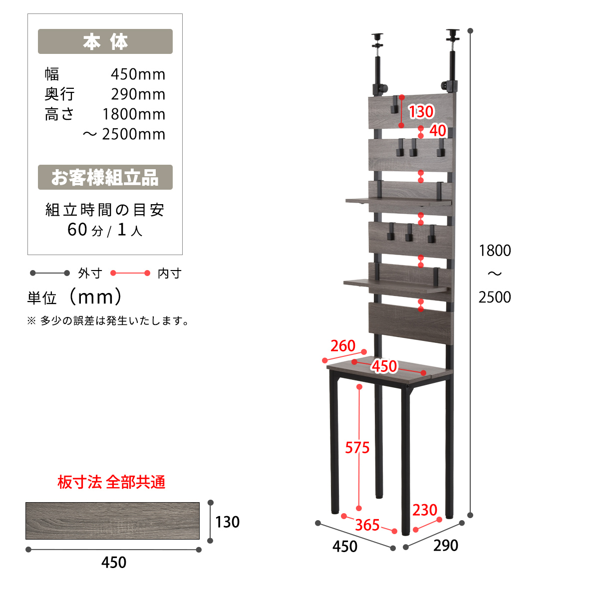 ■サイズ: 幅 450 × 奥行 290 × 高さ 1800-2500 mm ■素材: 【前板・棚板】中質繊維板にメラミン貼り 【フレーム】スチールパイプ(粉体塗装) ■商品重量: 10.5kg ■耐荷重: 棚板:約15kg / 引っかけ棚:約5kg(1枚につき) / フック:約1kg(1本につき)=全体約32kg ■仕様: 要組立品 (組立時間約60分/1人) |