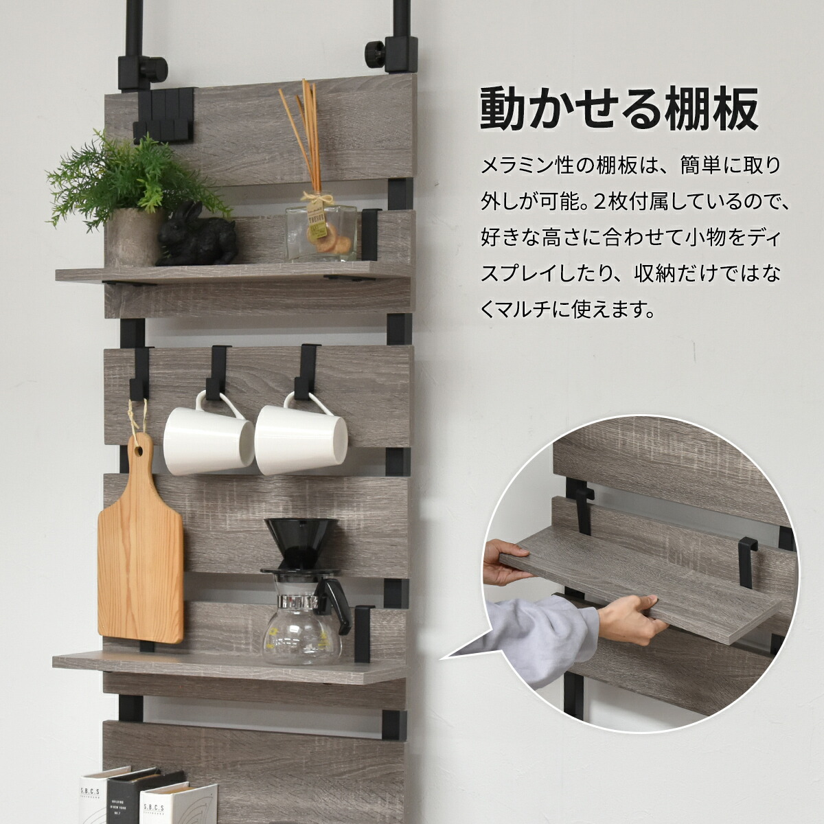 フックで引っ掛ける可動棚が2枚付属、使う場所や用途によって手軽にレイアウトできます。