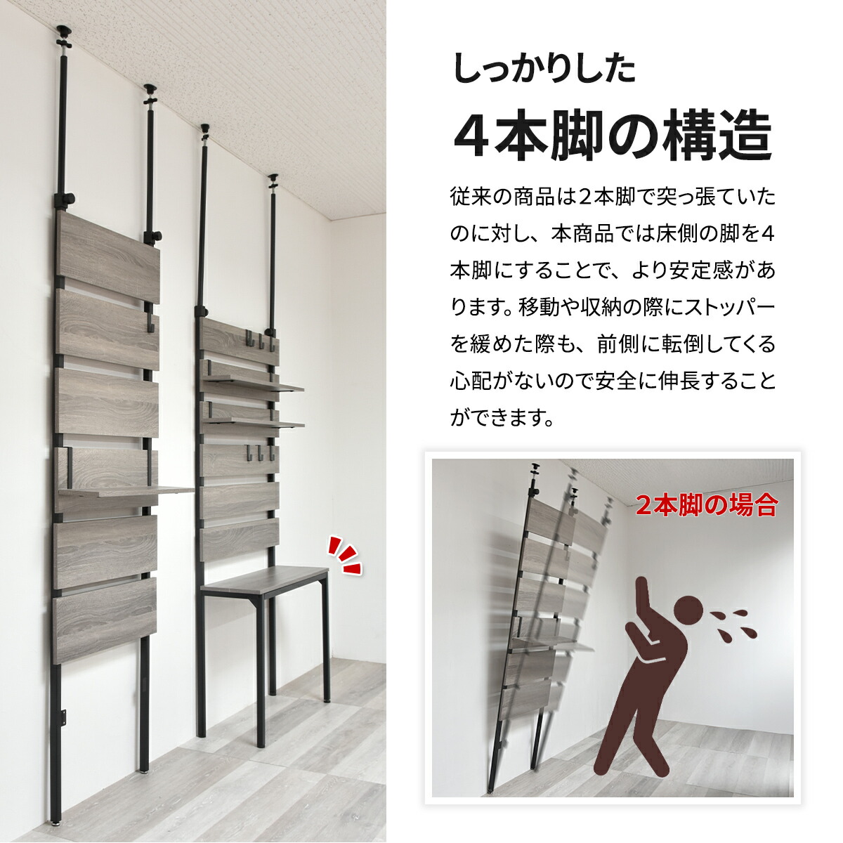 一般的な突っ張り式の壁面収納は2本脚ですが、本商品は4本脚になっているので安定感があります。