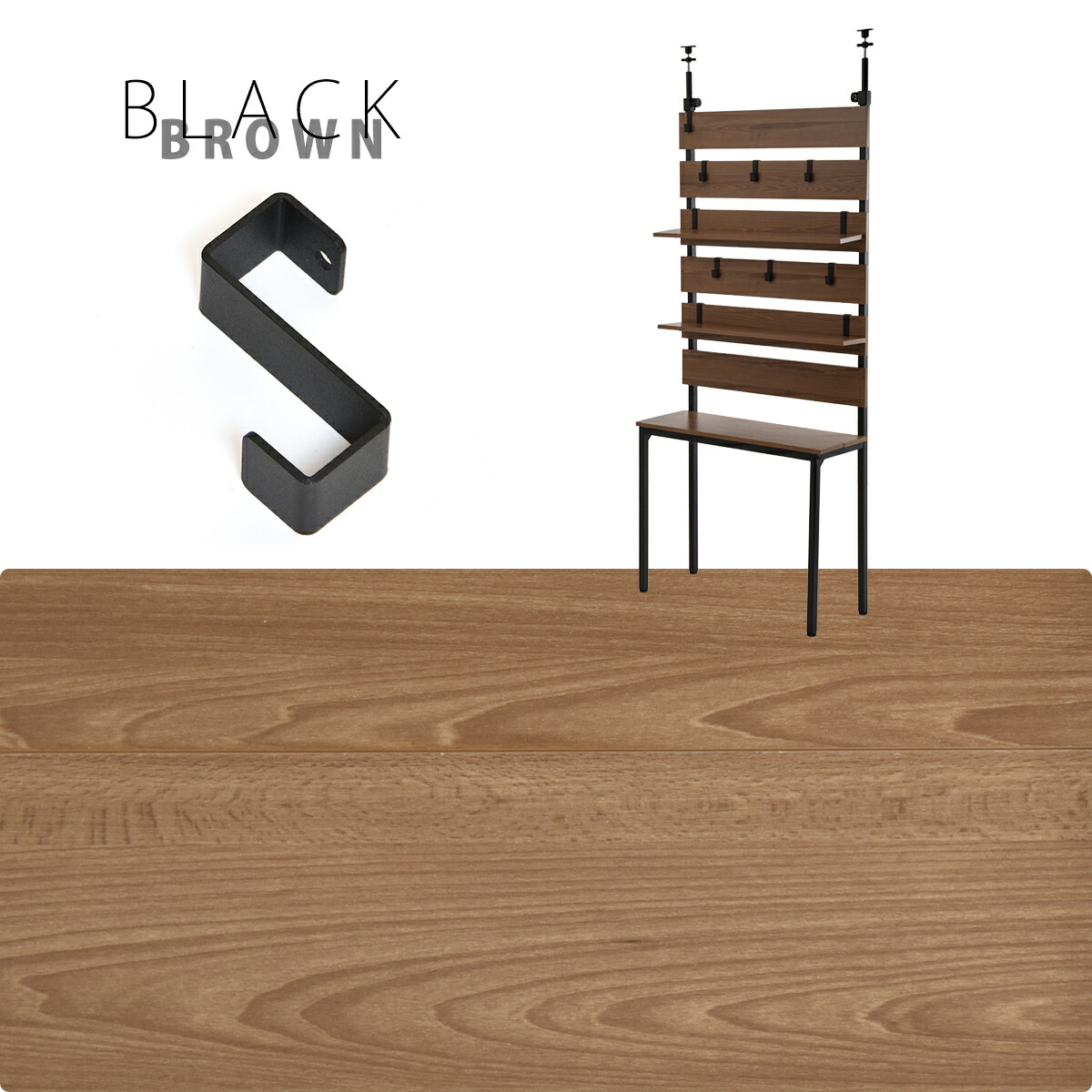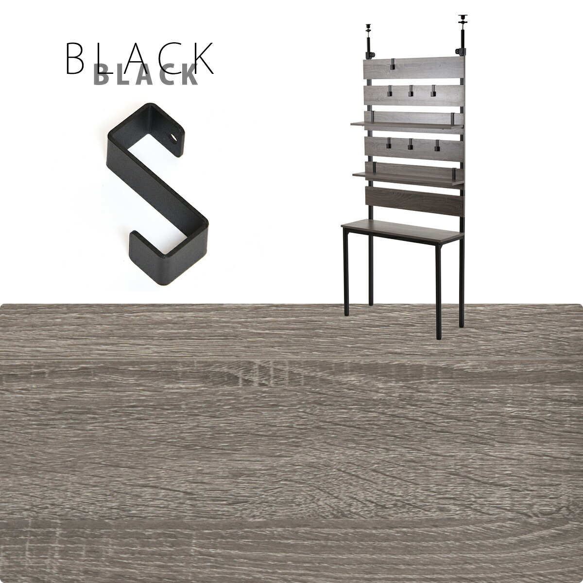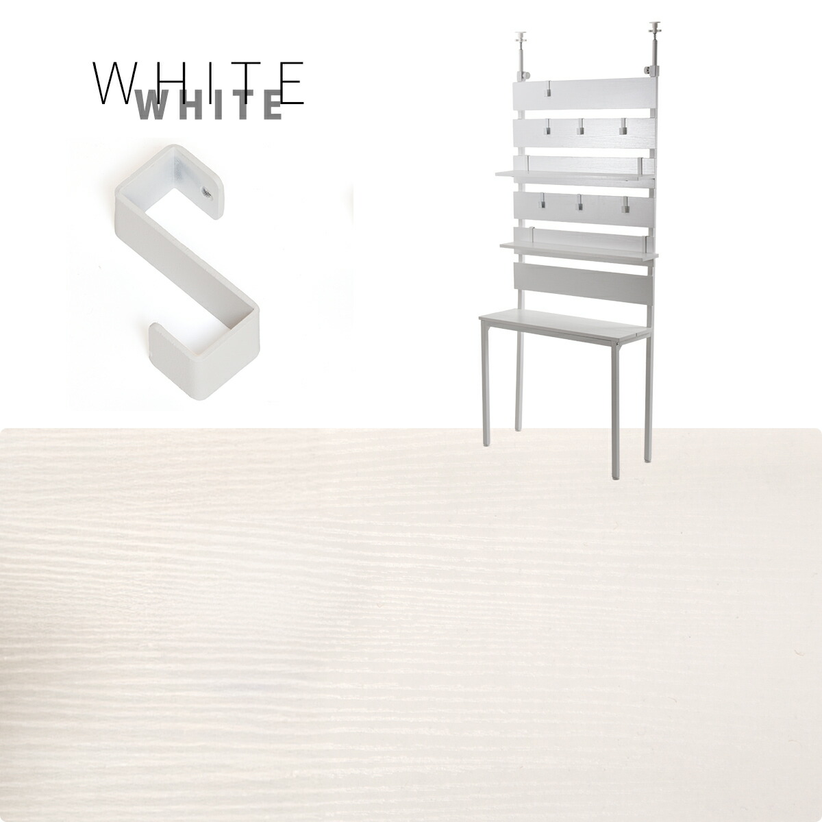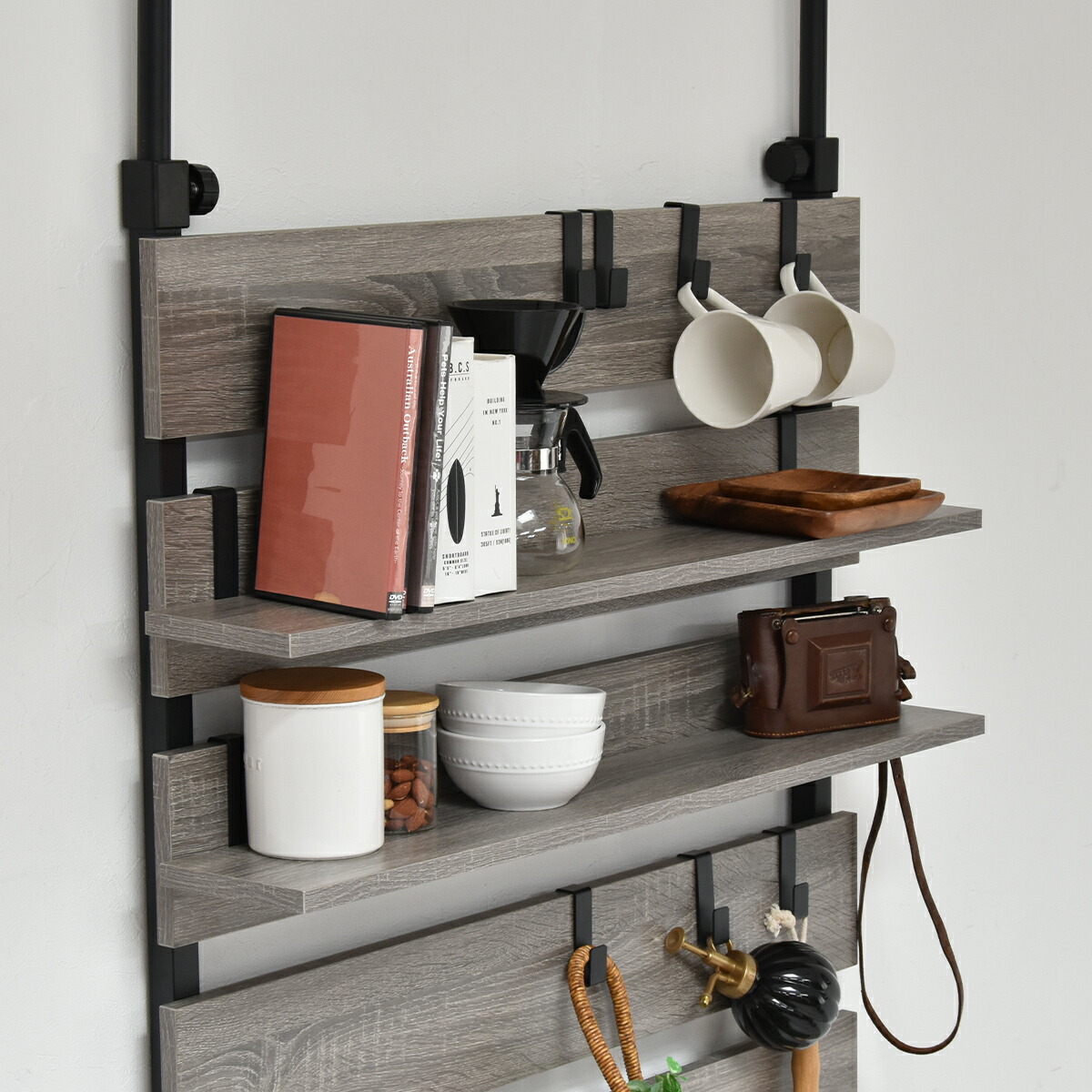 パネルに直接引っ掛けられる専用フックは、鞄や取っ手付きの収納、小物が引っ掛けられる優れもの。