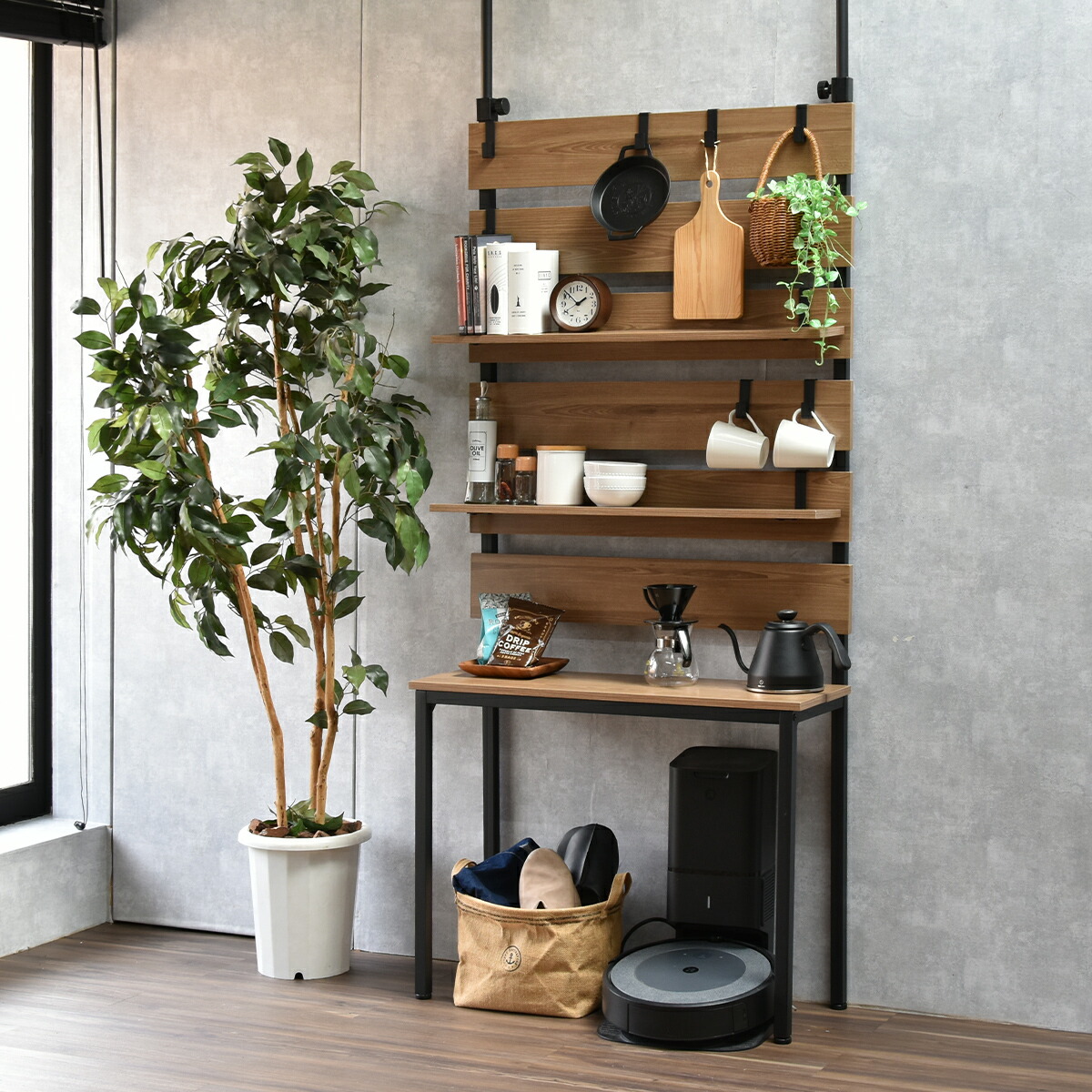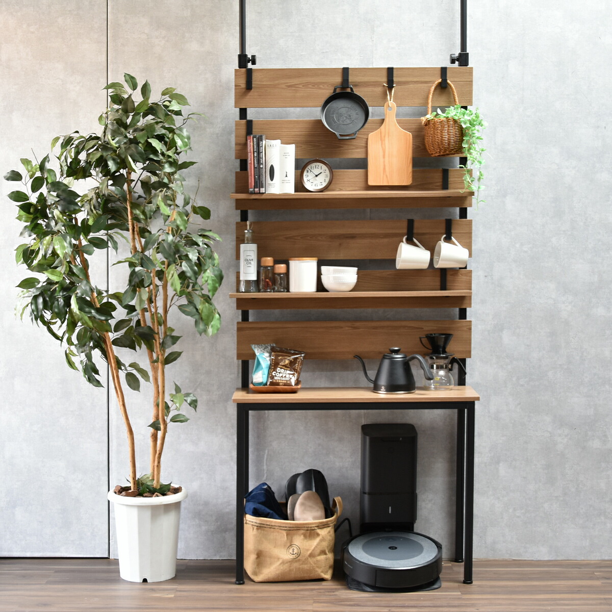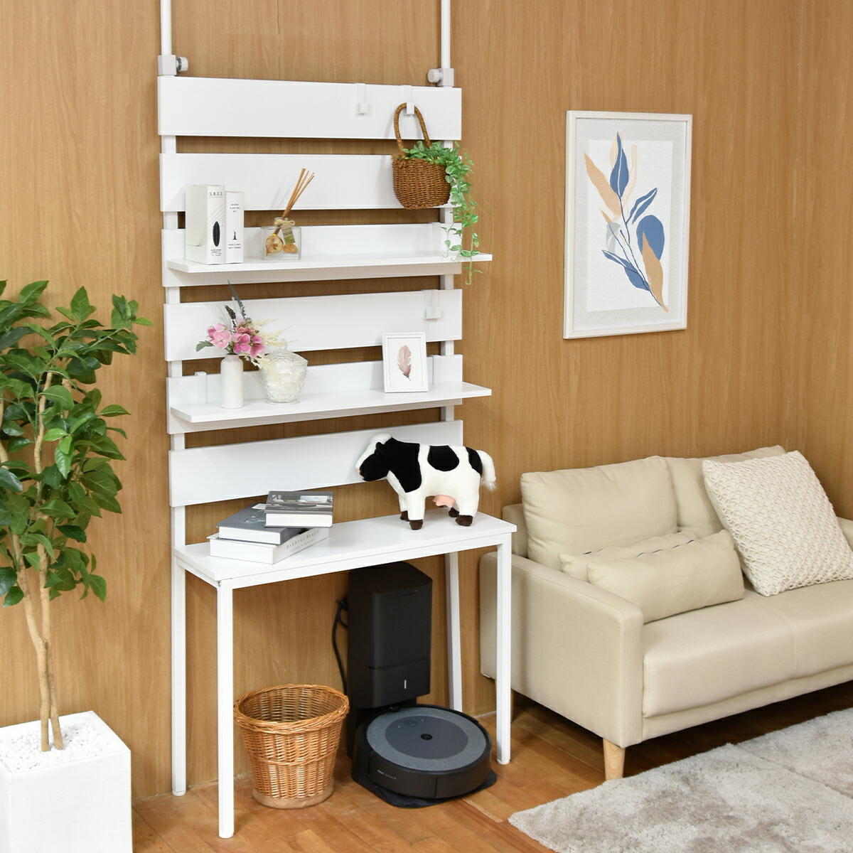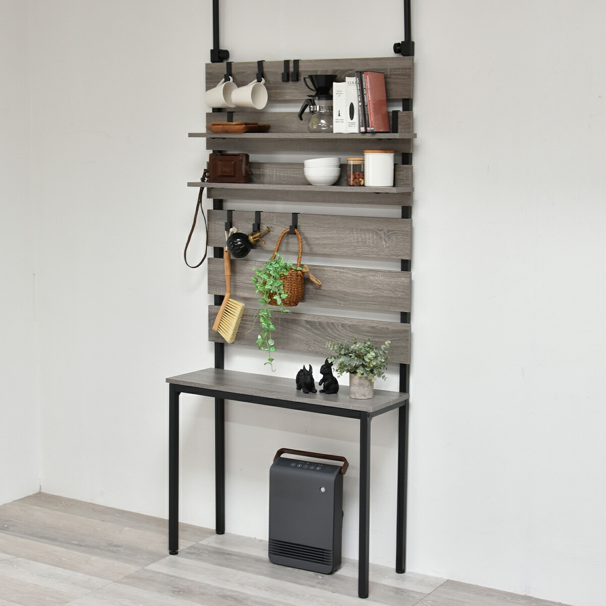 意外となかった、壁面ラックの変化形商品!お掃除ロボや石油ファンヒーターなどの上には物が置けずにデッドスペースになりがちな悩みを解消する壁面収納ラックです。脚の上に置かれた棚板は取り外し式になっているため、上からお掃除ロボのごみの回収もできて便利。意外となかった機能的に変化した壁面収納ラックです。 |