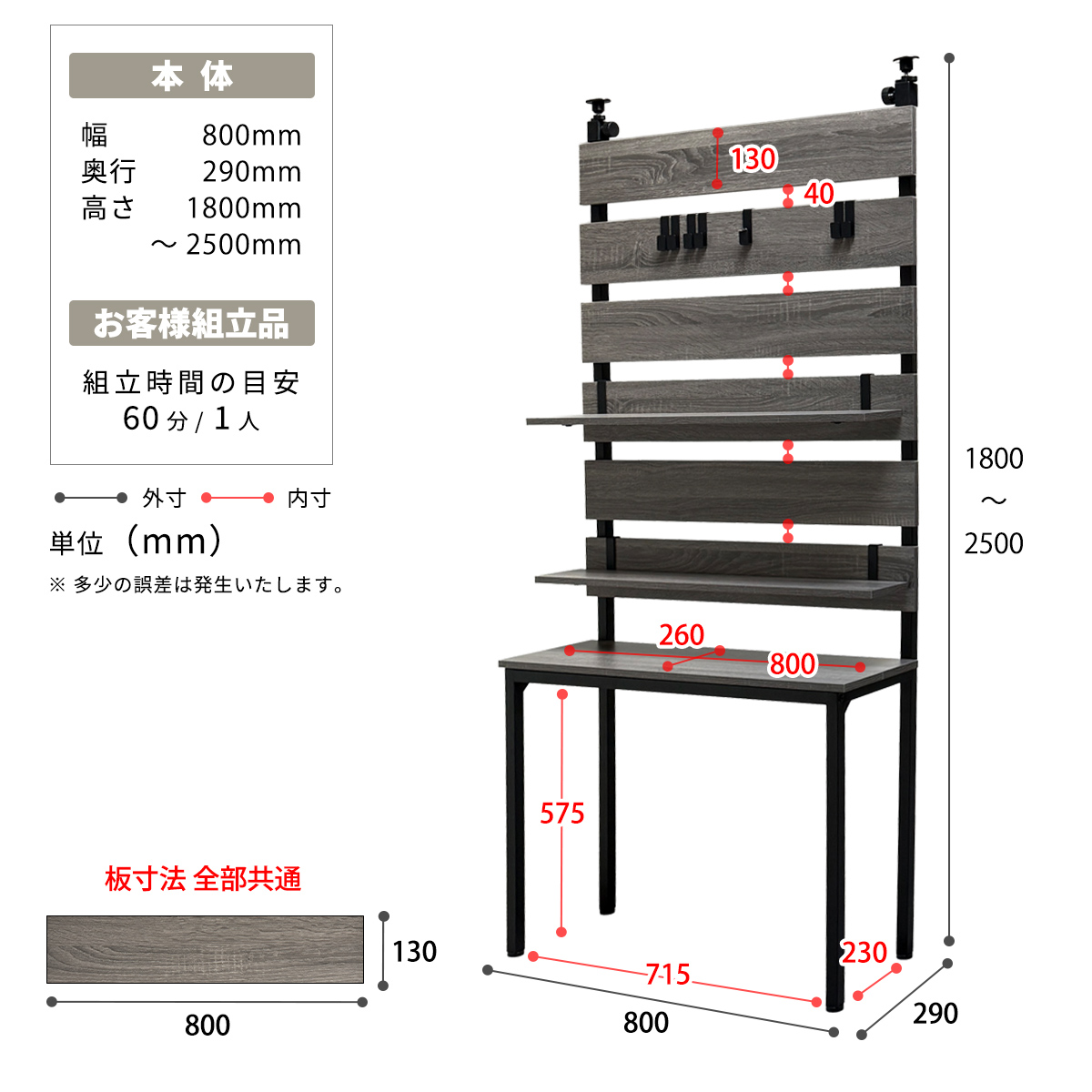 ■サイズ: 幅 800 × 奥行 290 × 高さ 1800-2500 mm ■素材: 【前板・棚板】中質繊維板にメラミン貼り 【フレーム】スチールパイプ(粉体塗装) ■商品重量: 15.5kg ■耐荷重: 棚板:約15kg / 引っかけ棚:約5kg(1枚につき) / フック:約1kg(1本につき)=全体約32kg ■仕様: 要組立品 (組立時間約60分/1人) |