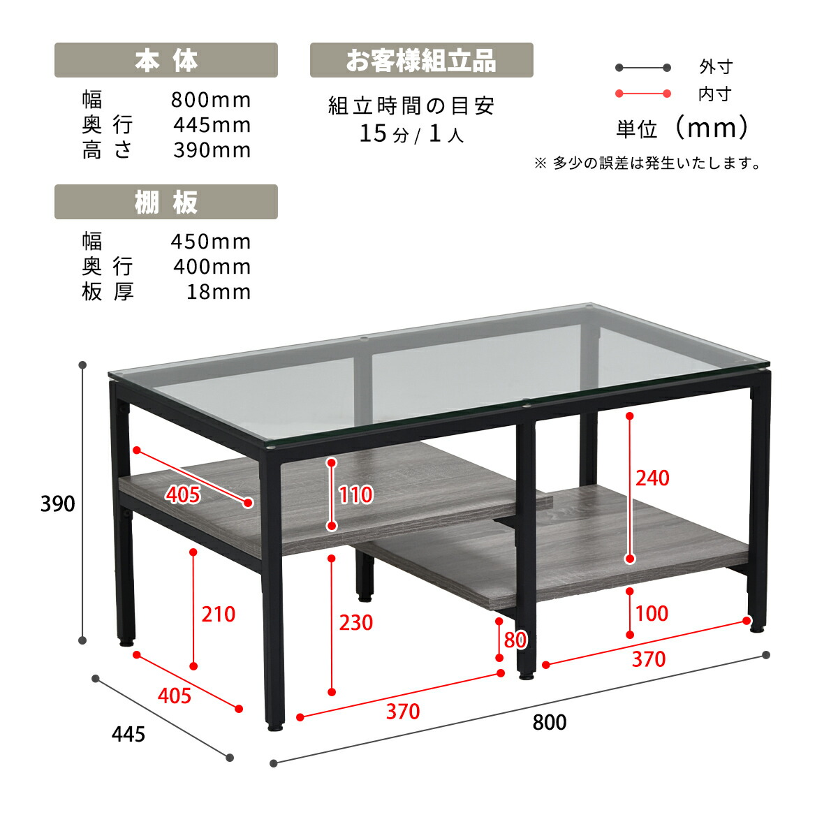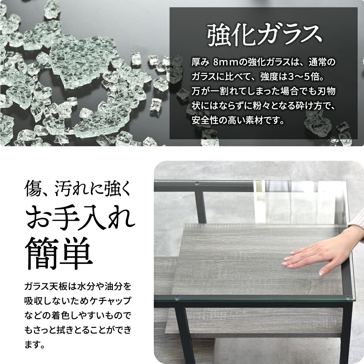 ■サイズ: 幅 800 × 奥行 445 × 高さ 390 mm ■素材: 【天板】8mm強化ガラス 【棚板】中質繊維板にメラミン貼り 【脚】スチールパイプ(粉体塗装) ■商品重量: 14kg ■耐荷重: 天板:約25kg 棚板(1枚あたり):10kg ■仕様: 要組立品 (組立時間約30分/1人) |