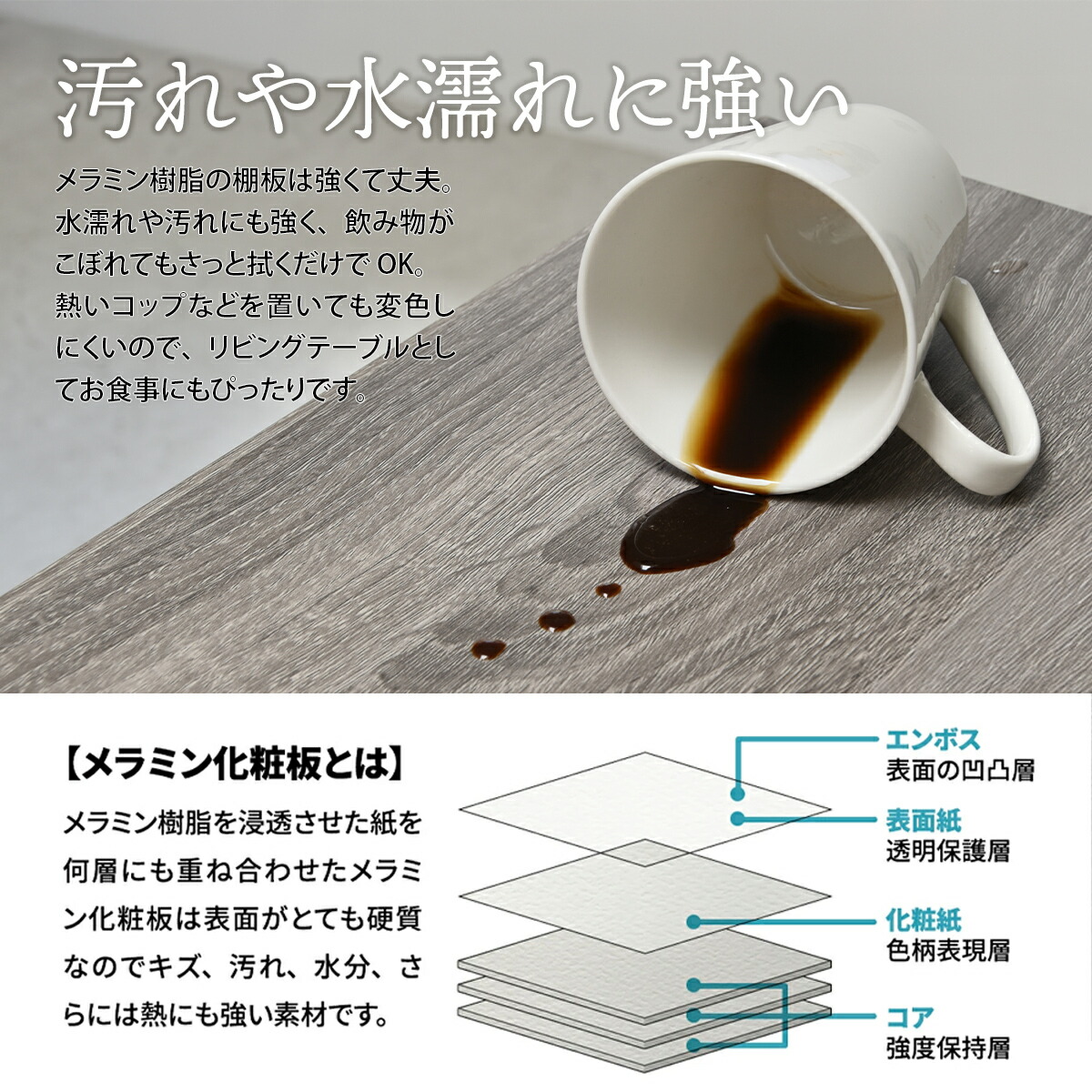 メラミン樹脂の棚板は強くて丈夫。水濡れや汚れにも強く、飲み物がこぼれてもさっと拭くだけでOK。