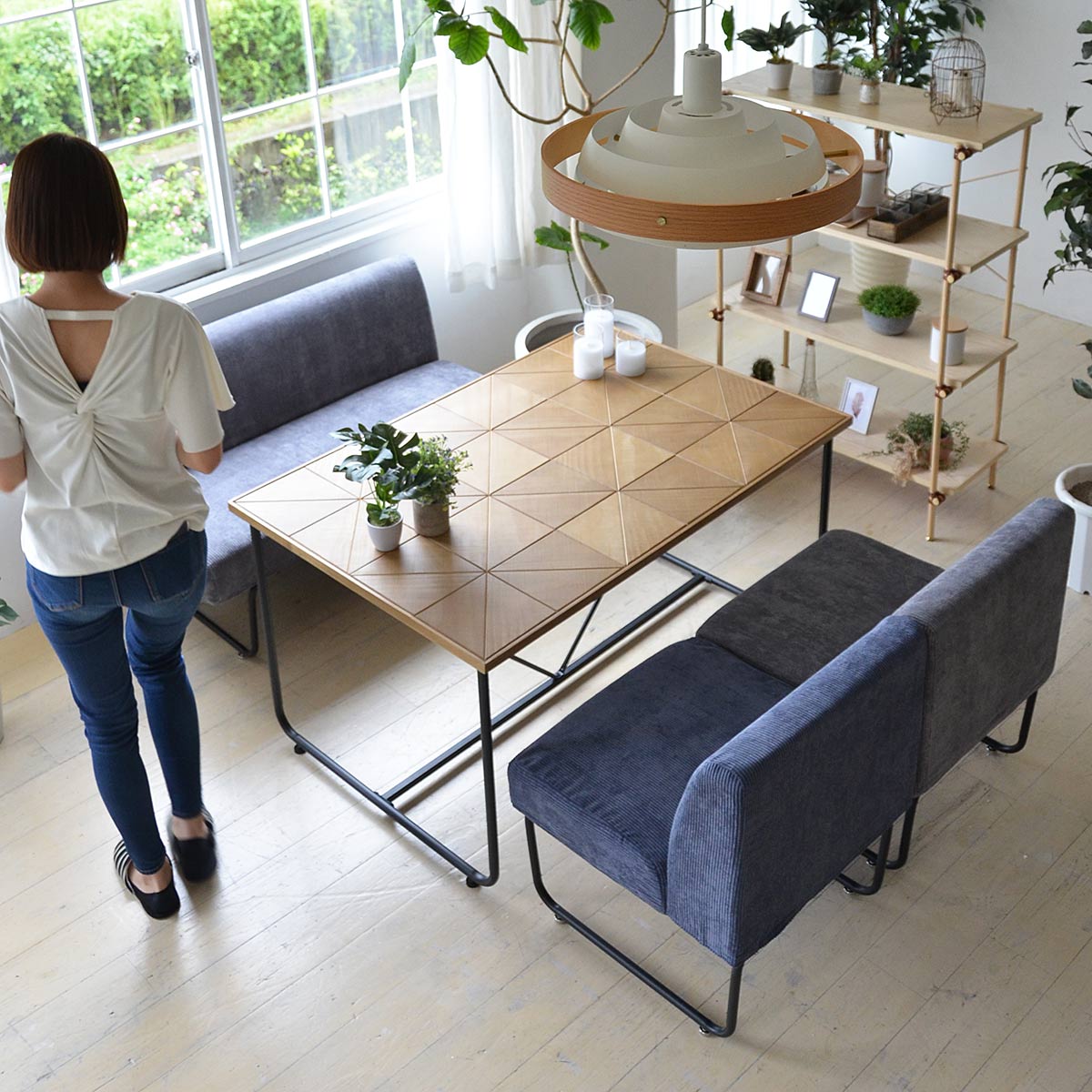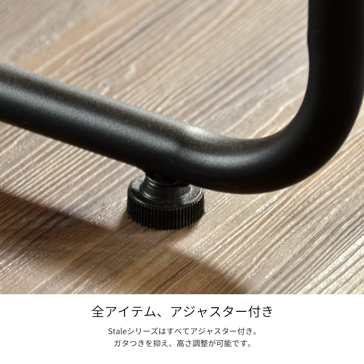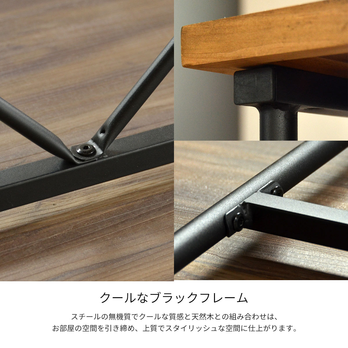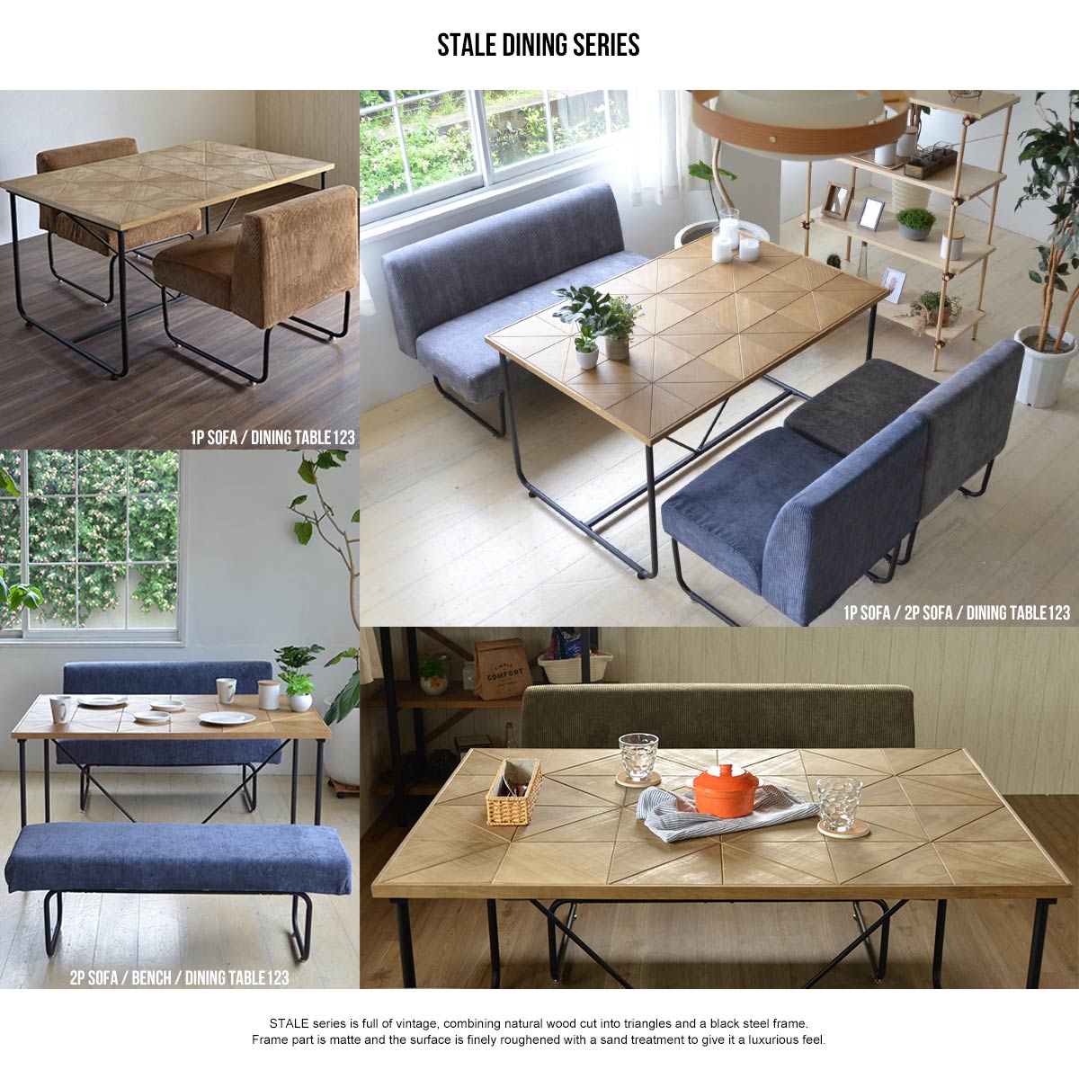 三角形にカットした天然木と黒のスチールフレームを組み合わせた落ち着いた印象のSTALE(スティル)シリーズのリビング・ダイニングシリーズ。木材の表面は触ったときに少しザラっとするような加工を施し、見た目をアンティークな雰囲気に。